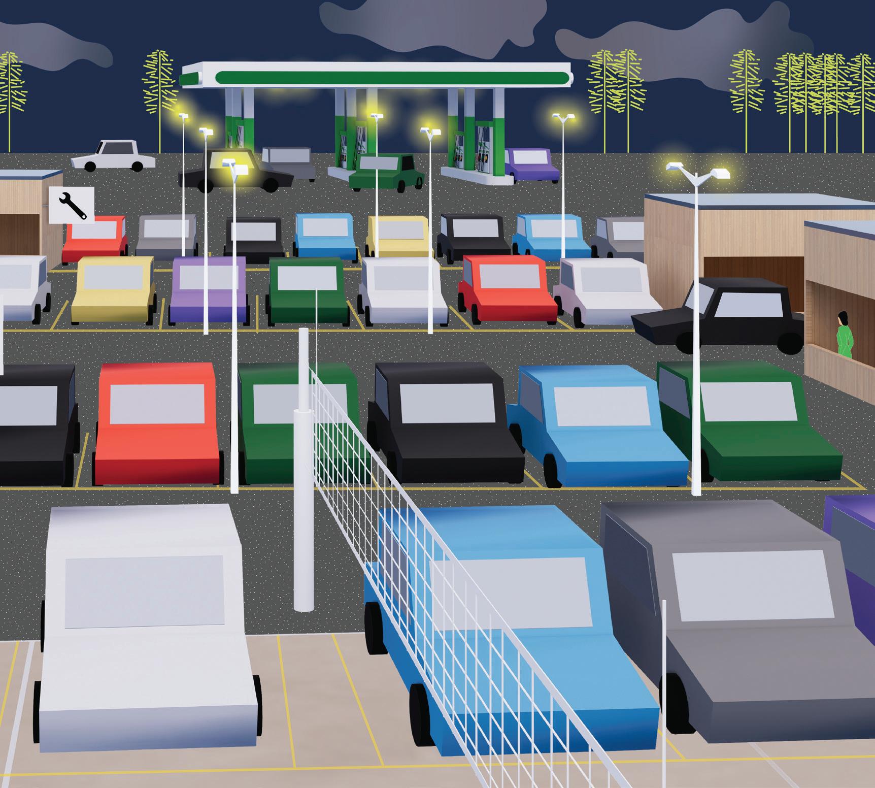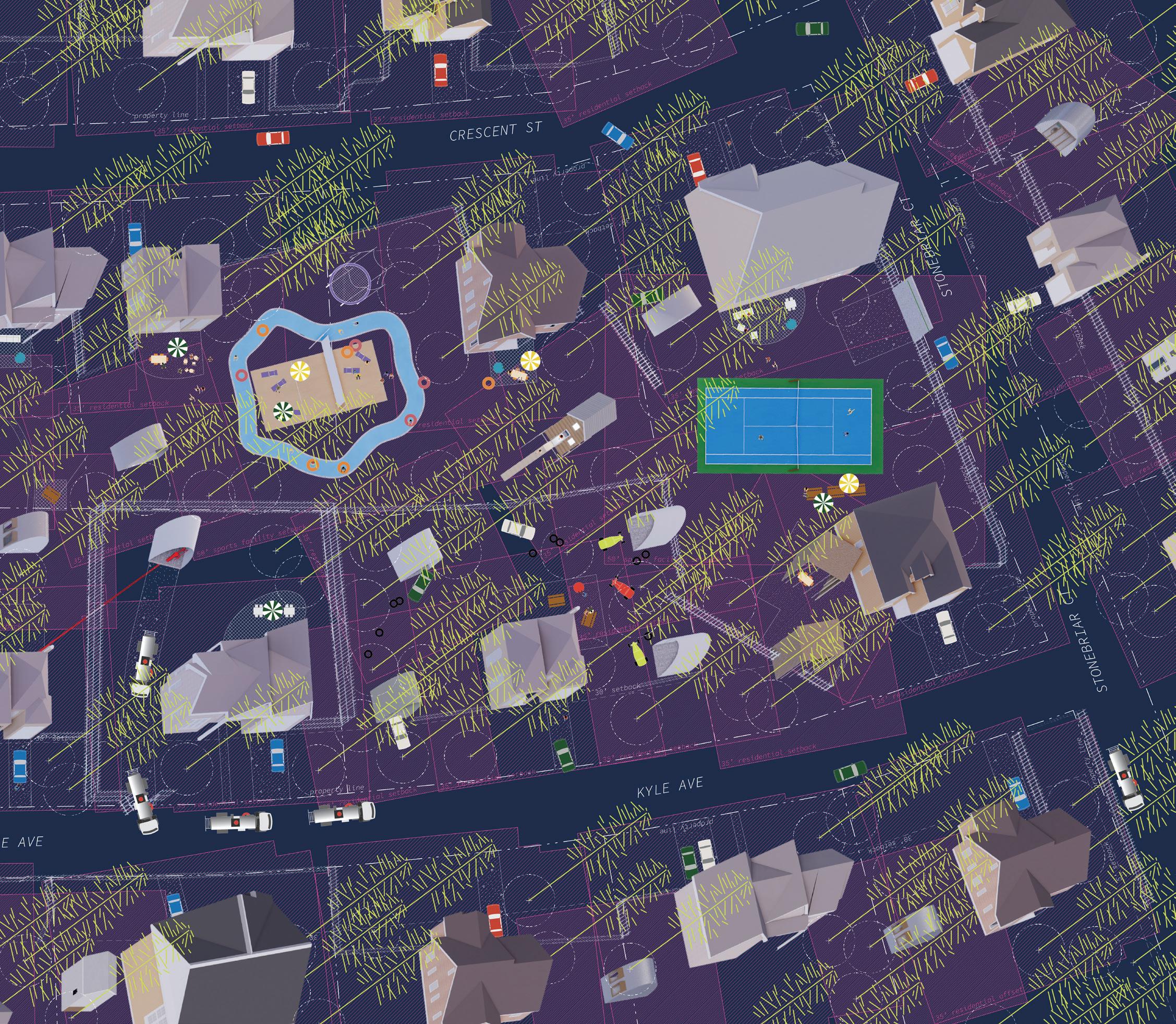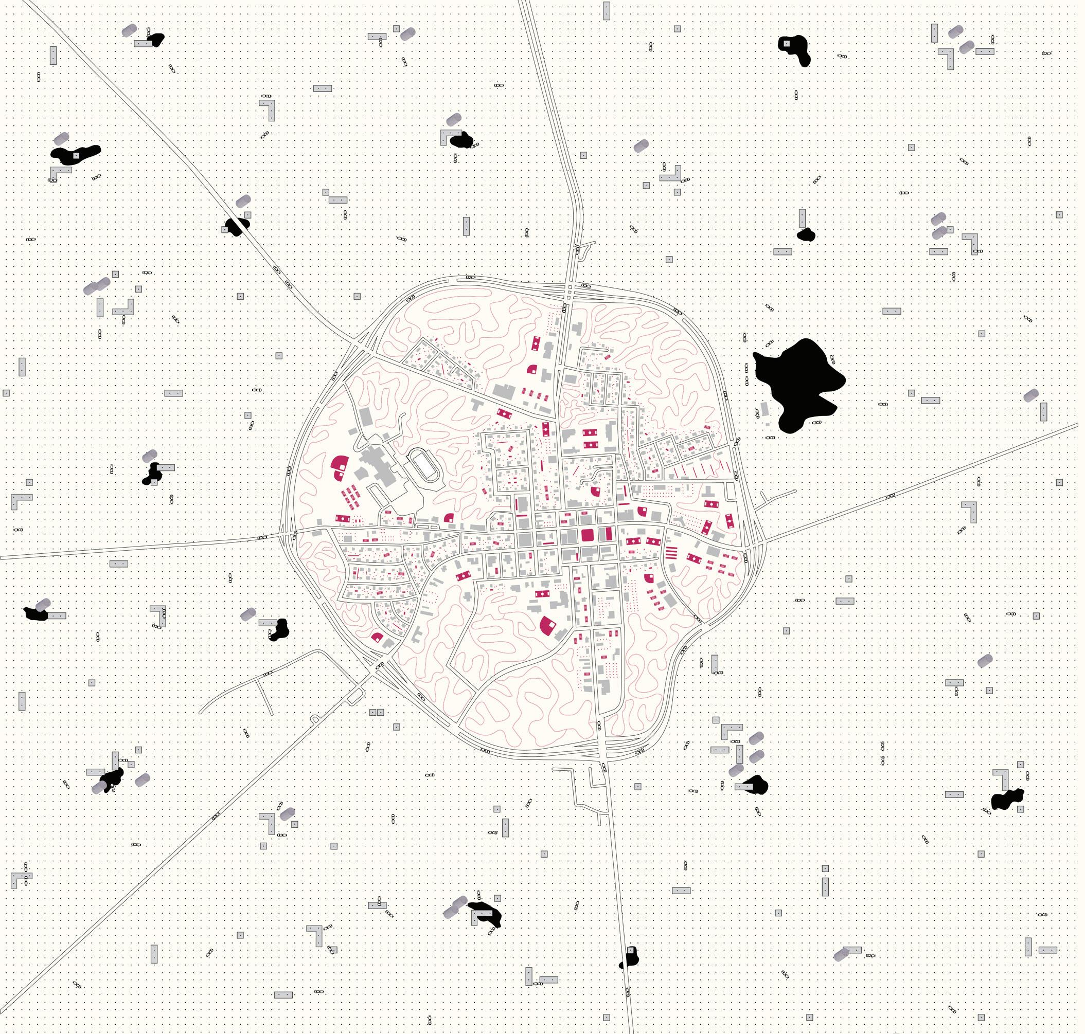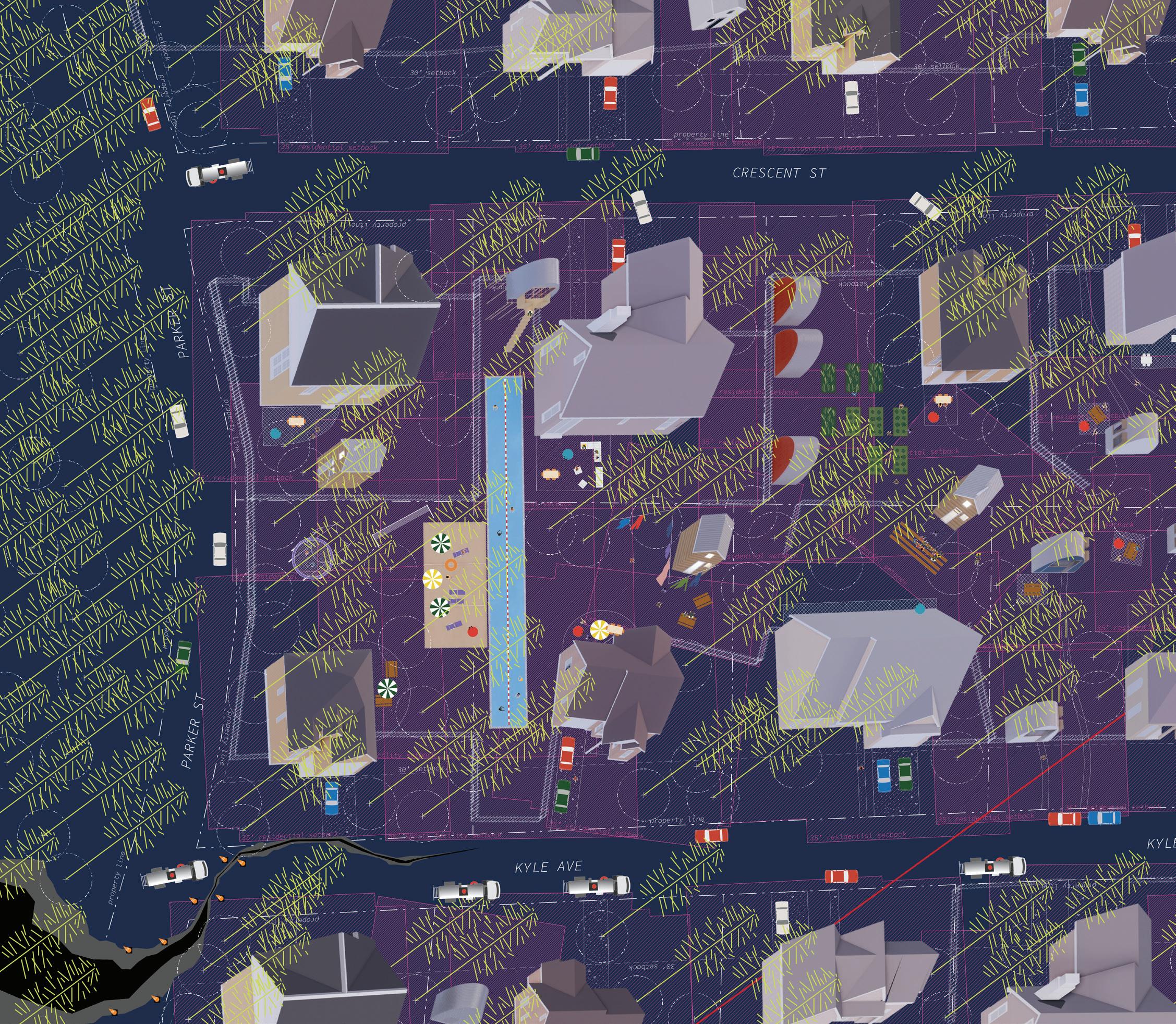In the imagined future, fracking booms in the United States again. A new advent of fracking requires more injection wells for wastewater from fracking processes.With climate change and drought looming, many states under pressure to recycle wastewater tighten regulations on drilling new injection wells. In order to accommodate the volume of fracking wastewater produced in-state and imported from out-ofstate, Texas permits more injection sites without restraint. Several years later, the ground of Texas becomes more unstable from increased fluids and increased fluid pressure of high-density injections, creating seismic activity. In Carthage, a small town in East Texas, many residents use zoning loopholes to block injection wells in their own backyards; since many homeowners have sold their mineral rights, their only recourse is to densify the town with accessory structures and leave no space for injection wells. Neighbors form community land trusts to prevent injection wells in the town’s green spaces. Strategic accessory guesthouses and sporting facilities quickly fill the town, sometimes turning private backyards into semi-public spaces and commercial strips into informal drive-through markets.