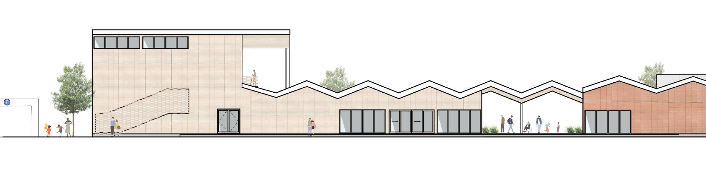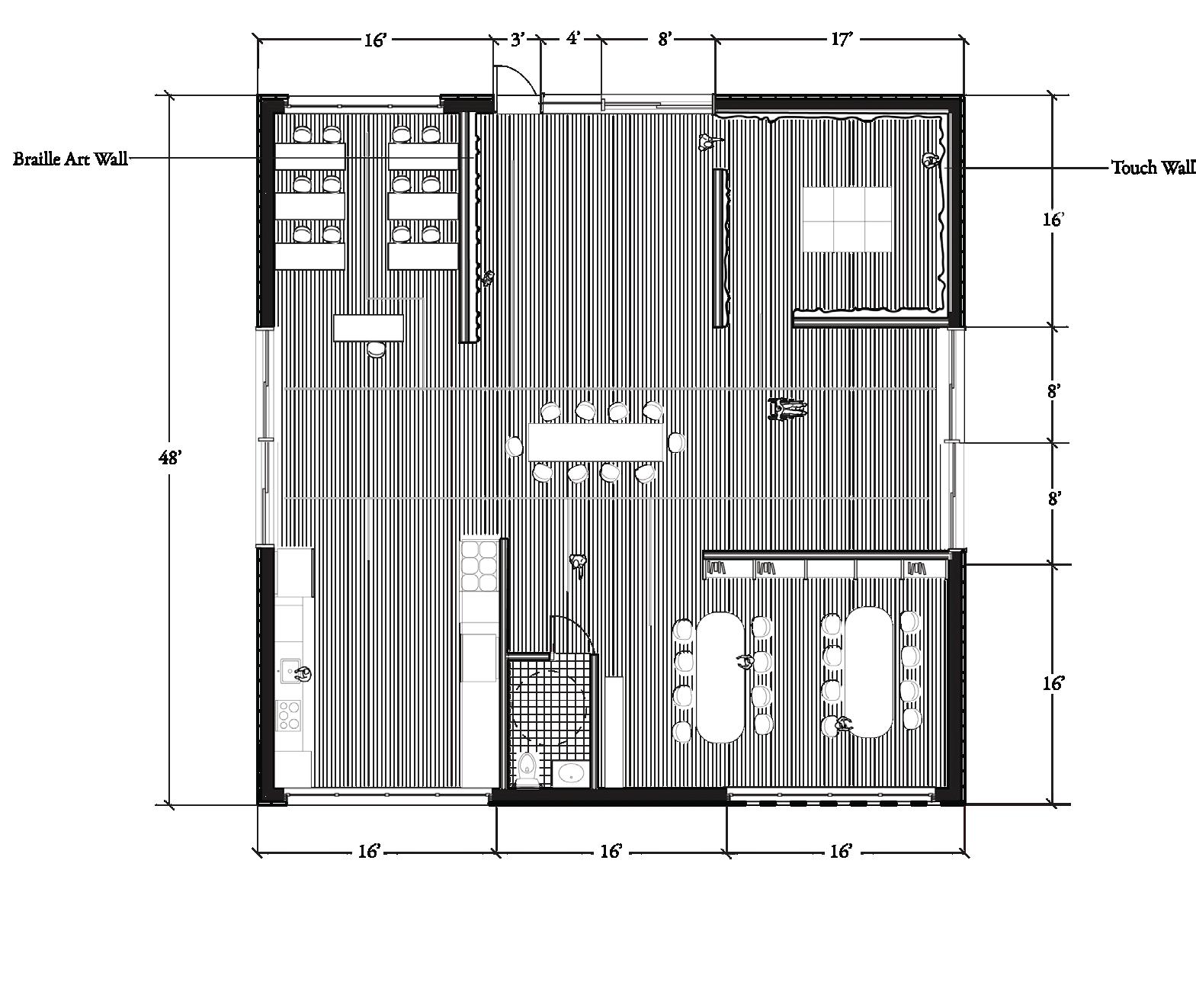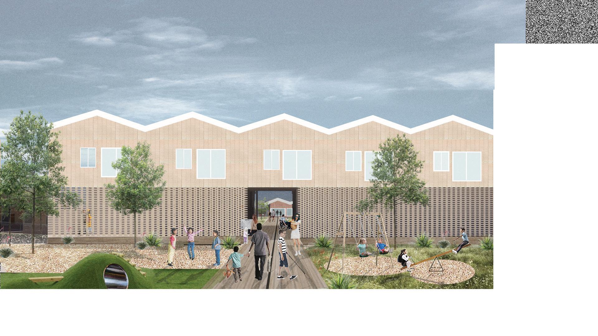 The Texas School for the Blind and Visually Impaired Expansion is organized around a large central courtyard, centering the belief that public space has the power to transform and enrich a neighborhood. The orthoganality of the overall arrangement enables navigational ease for sighted and non-sighted occupants as they access the expansion’s makerspace, eatery, or residences. Folded roofs create visual and acoustic interest and cantilever to create shaded walkways between buildings. The walkways mediate between indoors and outdoors, creating an easy transition while providing distinct acoustic and thermal conditions to give non-visual navigational markers. Through the simplicity of the overall plan and the experiential differences between indoor, covered walkway, and outdoor conditions, users can rely on multiple senses as they inhabit the project.