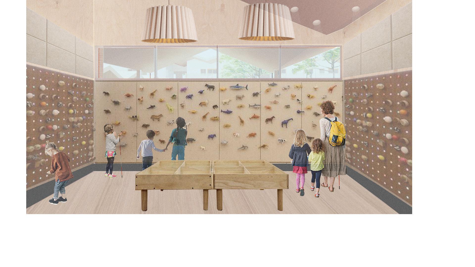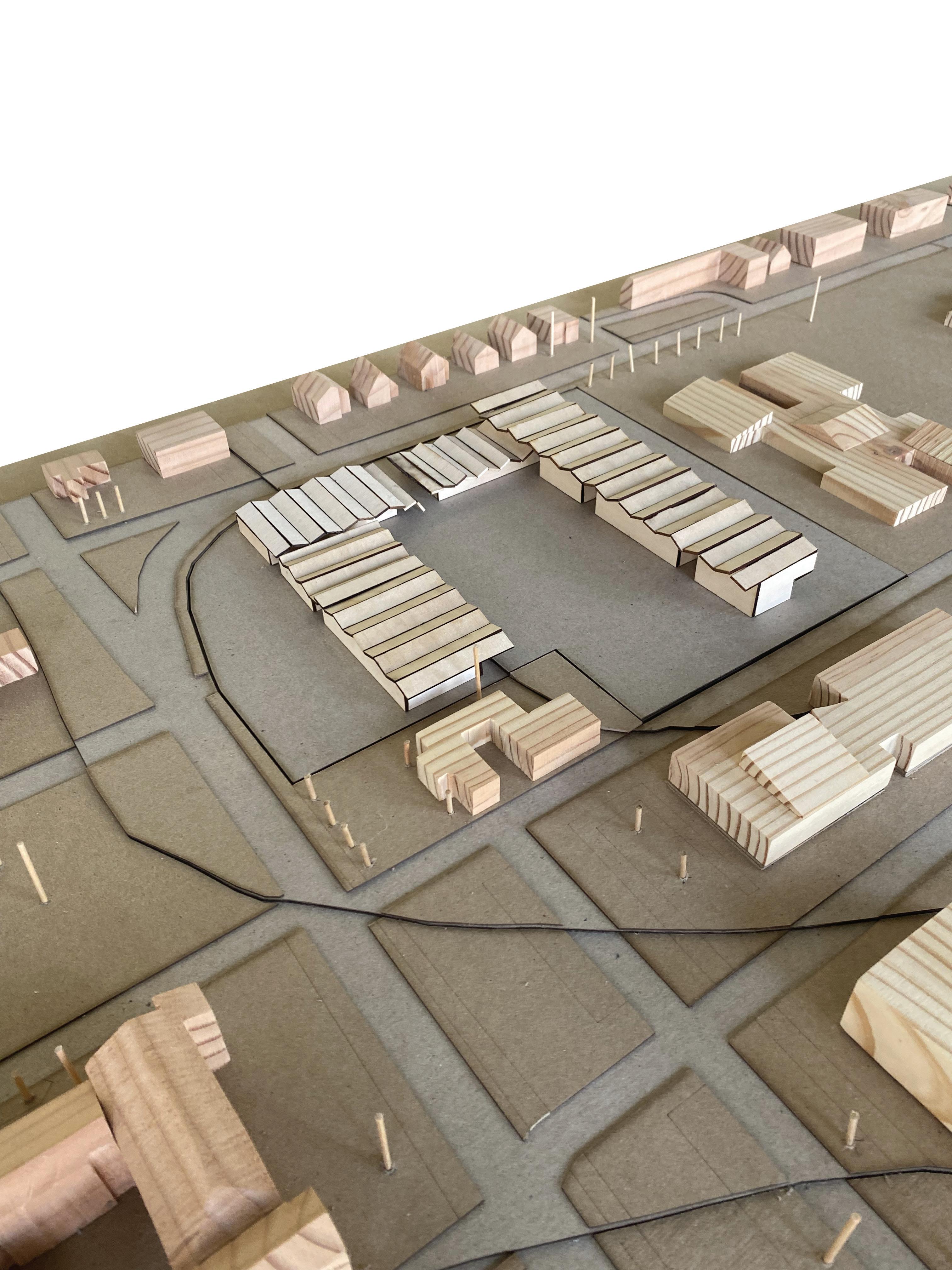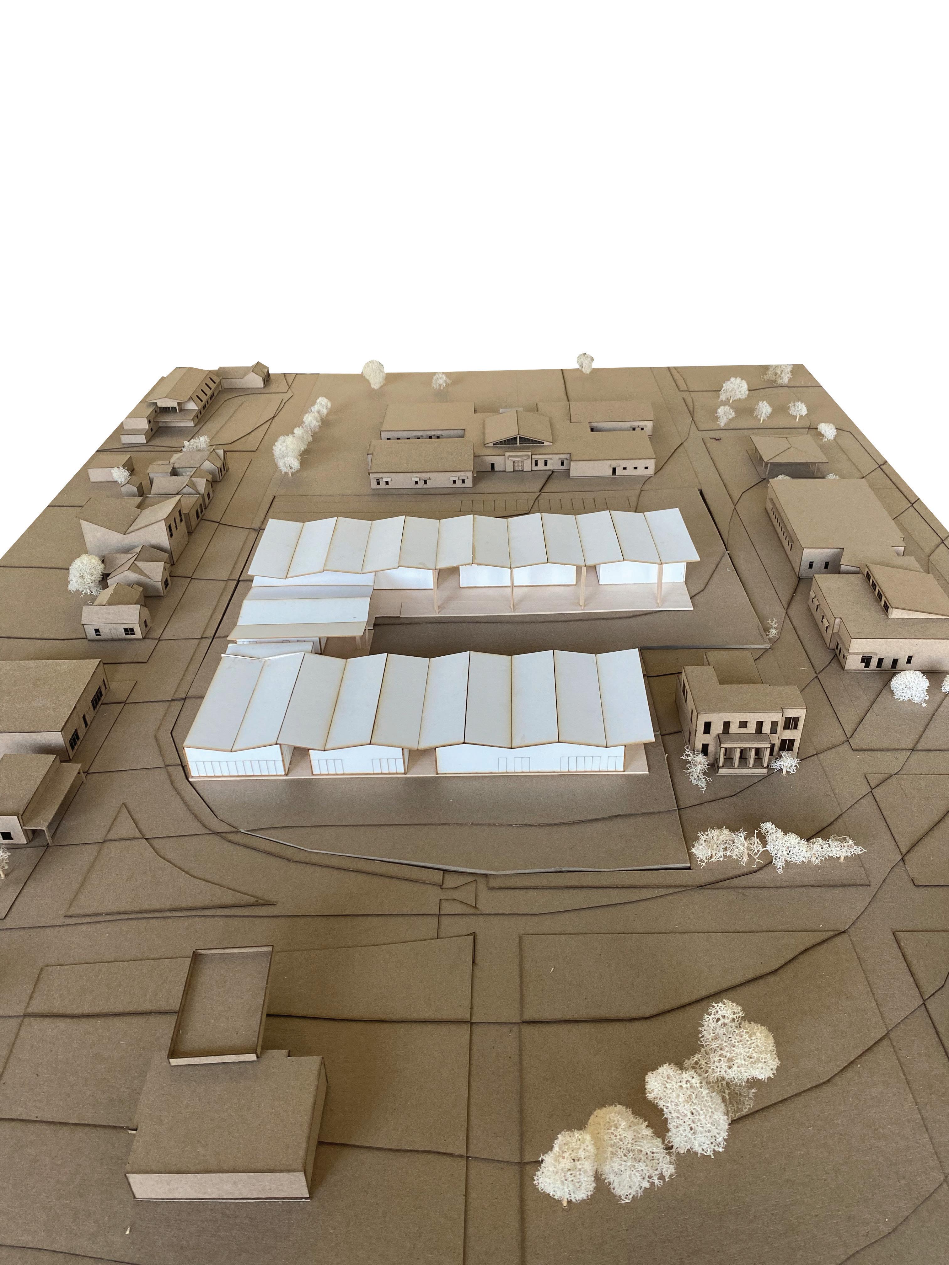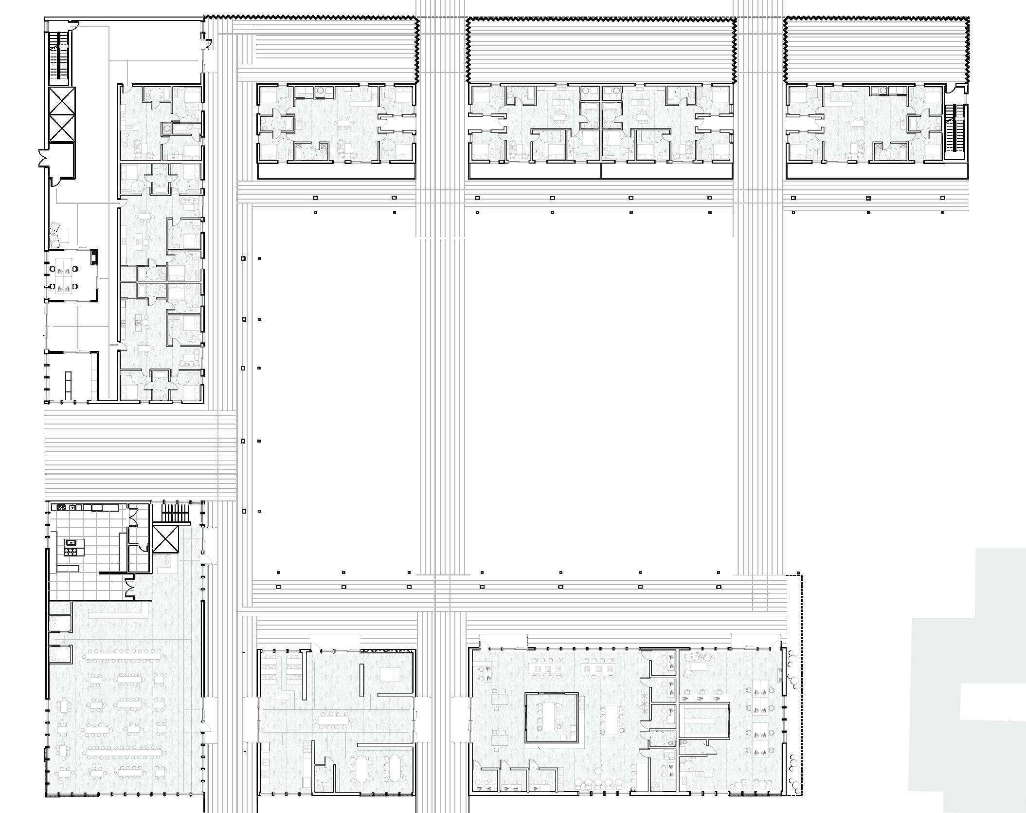 The Texas School for the Blind and Visually Impaired Expansion is organized around a large central courtyard, centering the belief that public space has the power to transform and enrich a neighborhood. The orthoganality of the overall arrangement enables navigational ease for sighted and non-sighted occupants as they access the expansion’s makerspace, eatery, or residences. Folded roofs create visual and acoustic interest and cantilever to create shaded walkways between buildings. The walkways mediate between indoors and outdoors, creating an easy transition while providing distinct acoustic and thermal conditions to give non-visual navigational markers. Through the simplicity of the overall plan and the experiential differences between indoor, covered walkway, and outdoor conditions, users can rely on multiple senses as they inhabit the project.