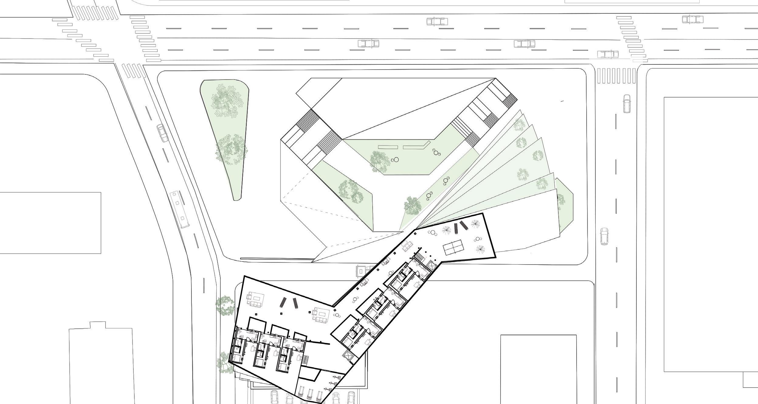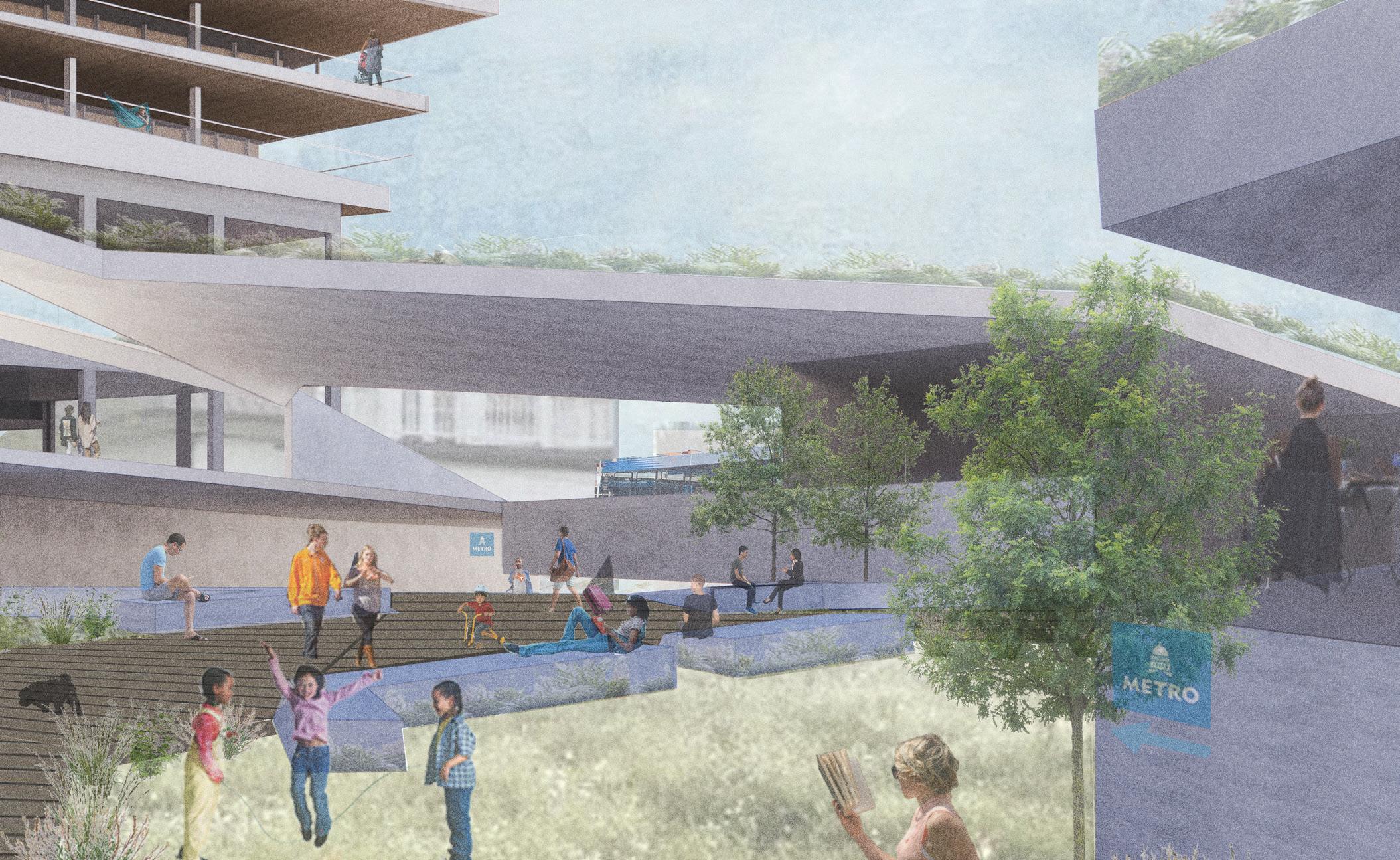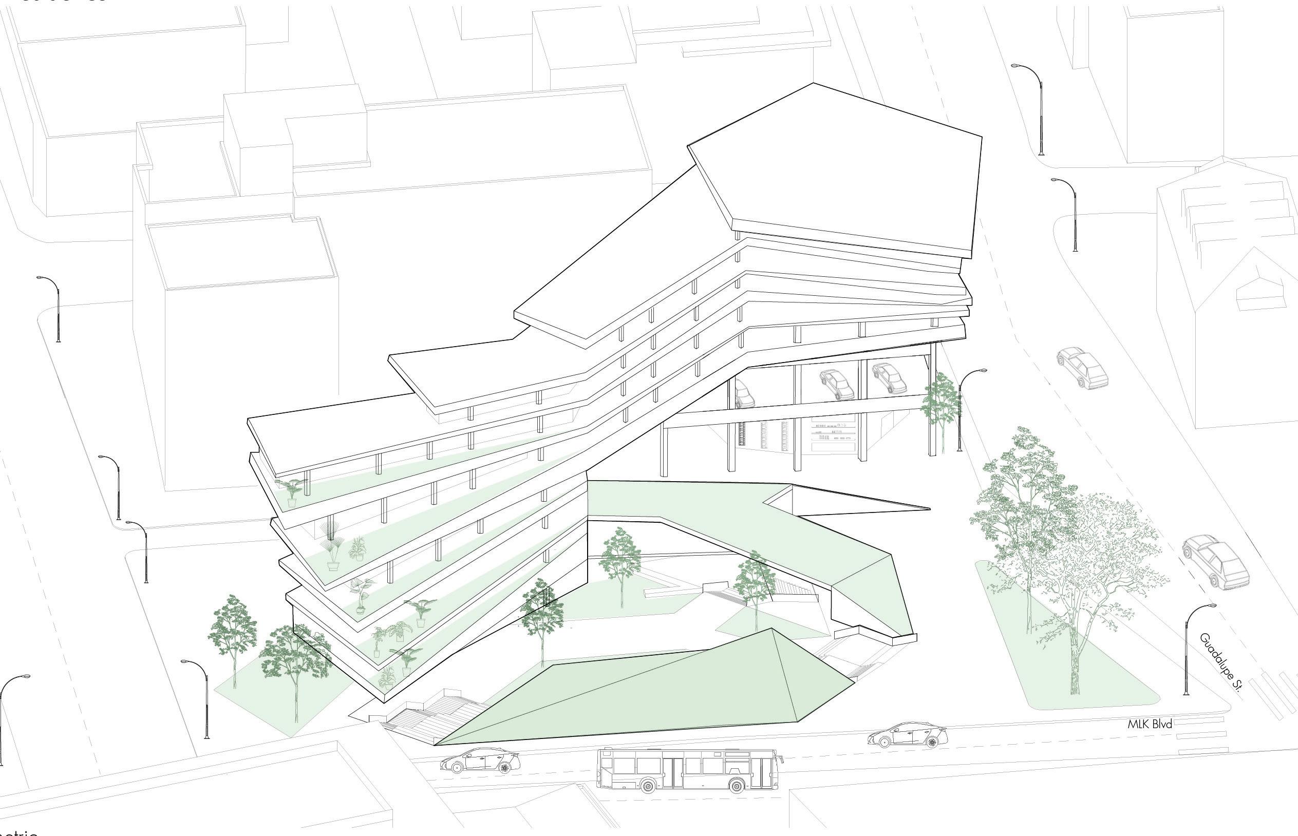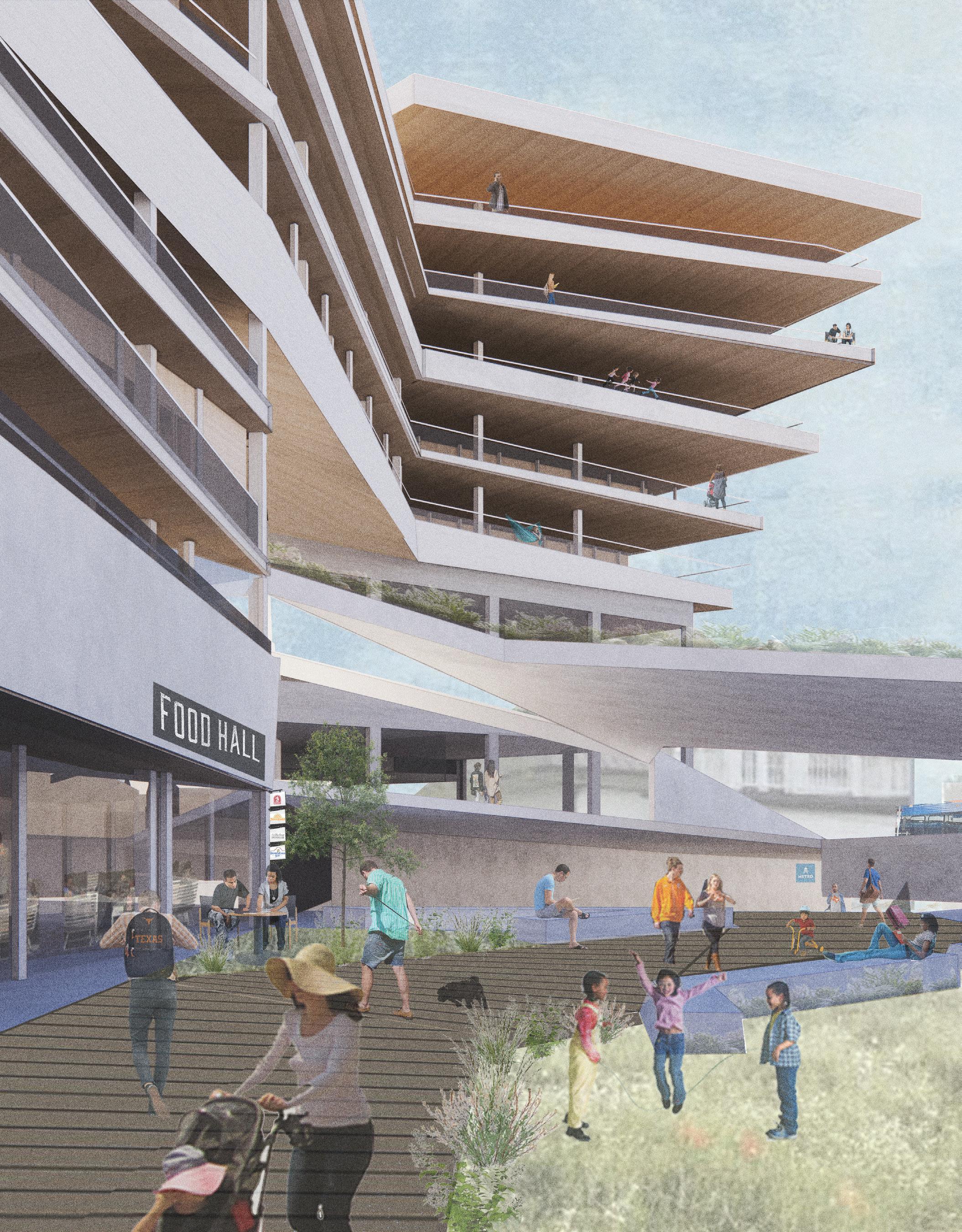 The proposed urban intervention consists of graduate student housing perched above an inviting public space and transportation hub for Austin’s new underground train. The recessed plaza, which opens up to the busy intersection of Guadalupe Street and Martin Luther King Jr. Boulevard, blocks noise from traffic and distances the housing complex from the street, while a food hall and adjoining green spaces draw passersby in and encourage the use of public transport. The orientation of the plaza subverts the local norm of exclusive, concealed spaces; it insists that as Austin continues to grow rapidly, the need for accessible public spaces likewise increases.