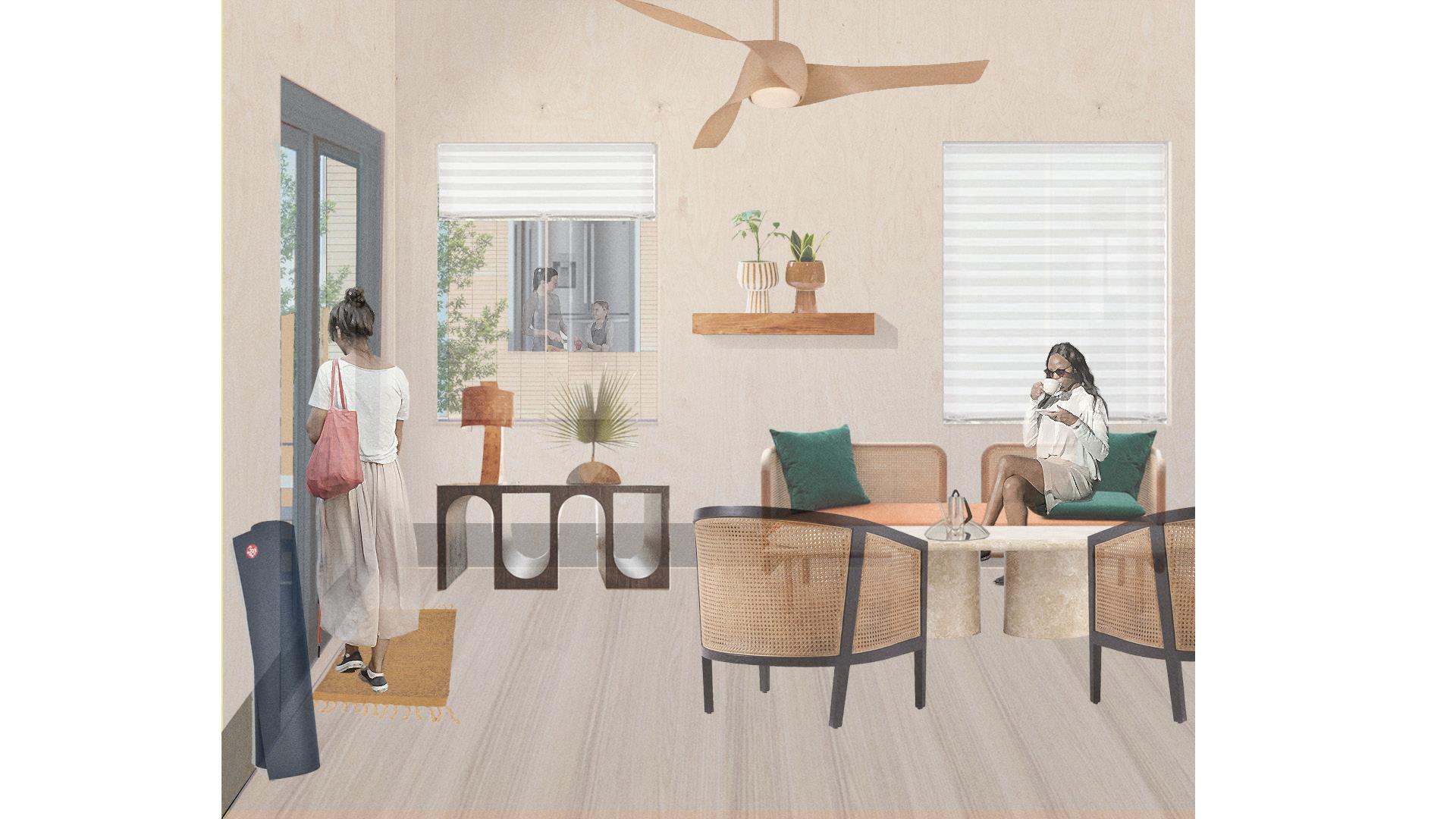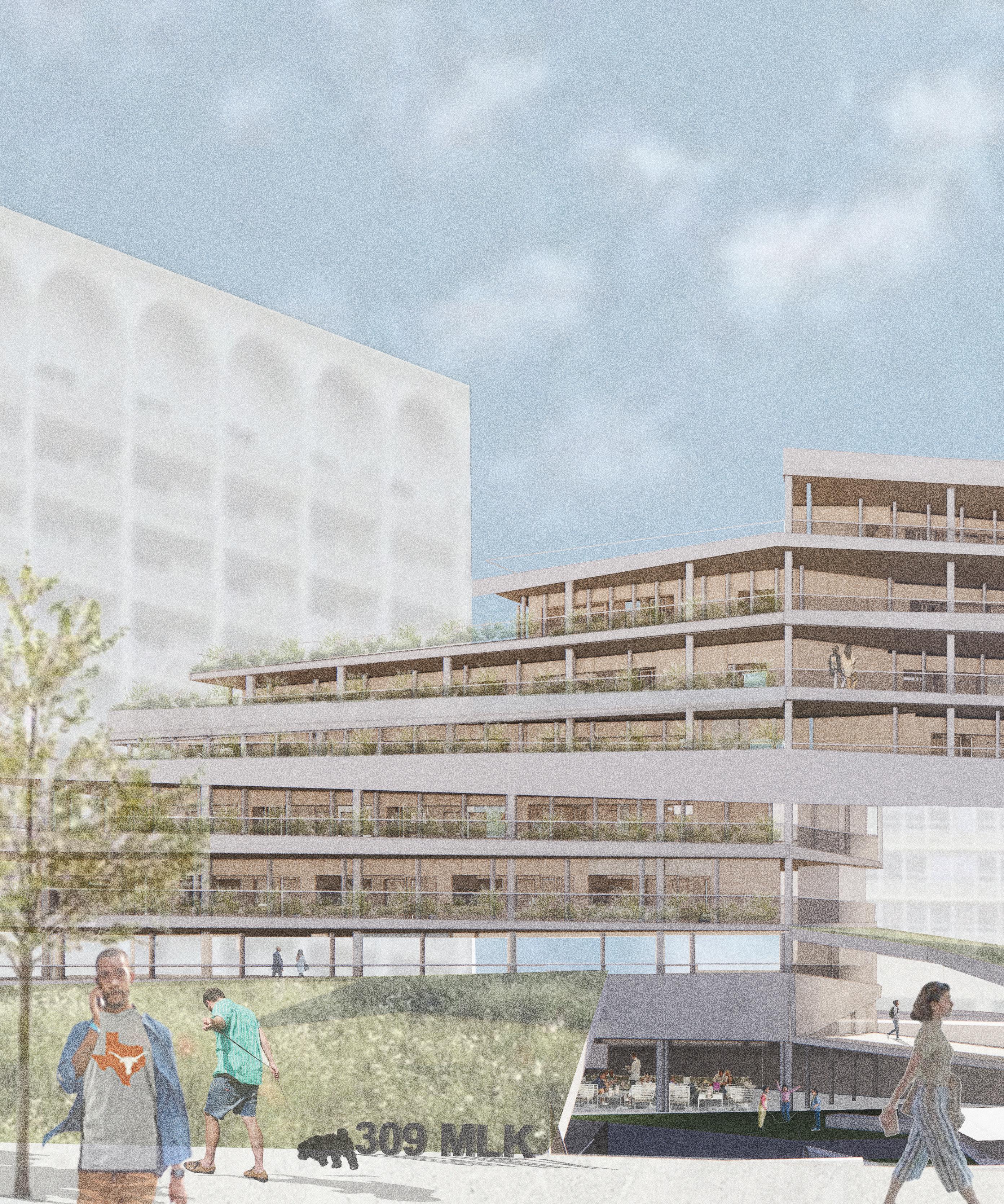 Stretching above the plaza and landing on an adjacent parking lot, the apartment building addresses the scarcity of inclusive graduate student housing near the University of Texas’s campus. These residences accommodate graduate students with young children by providing generous outdoor spaces for recreation. Each apartment is accessed from a deep loggia, reducing excessive heat gain while fostering connections between neighbors. The relatively compact size of each unit enables the apartments to remain affordable despite their central location.