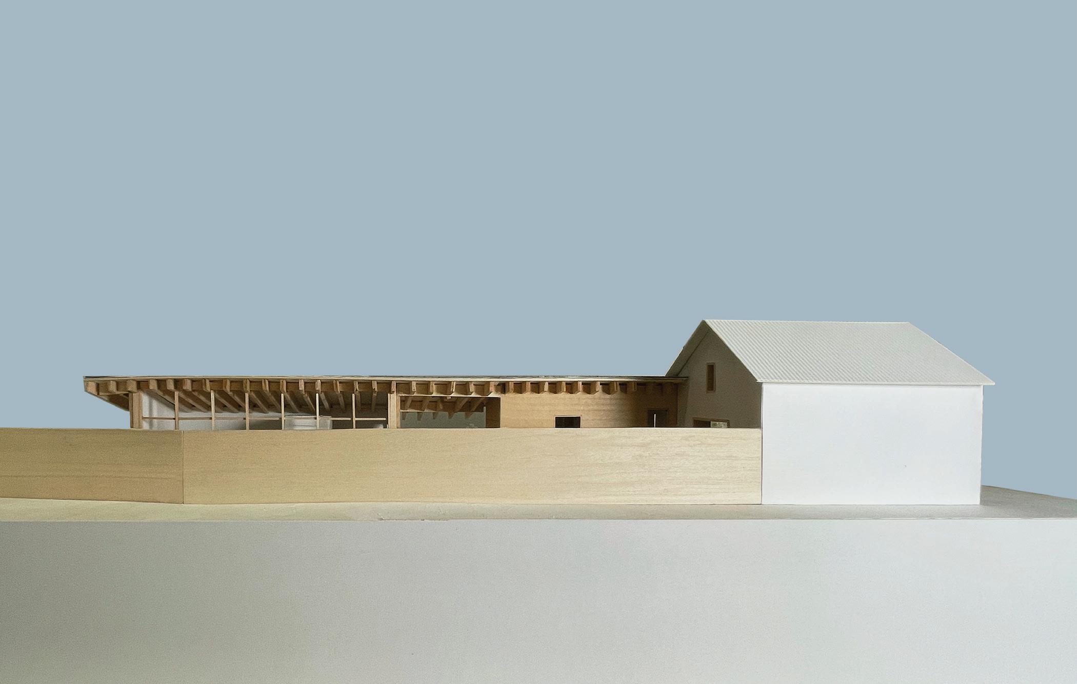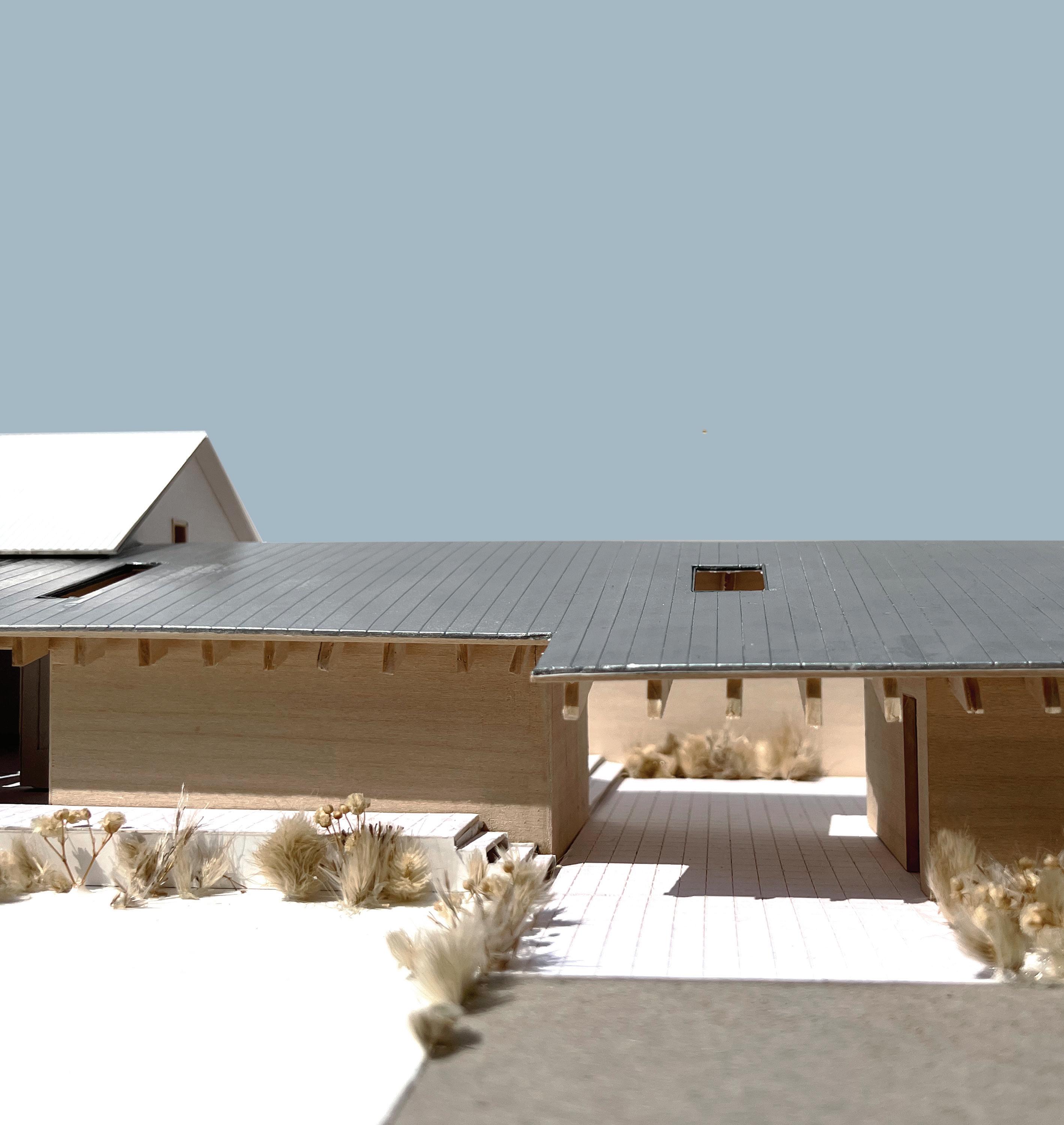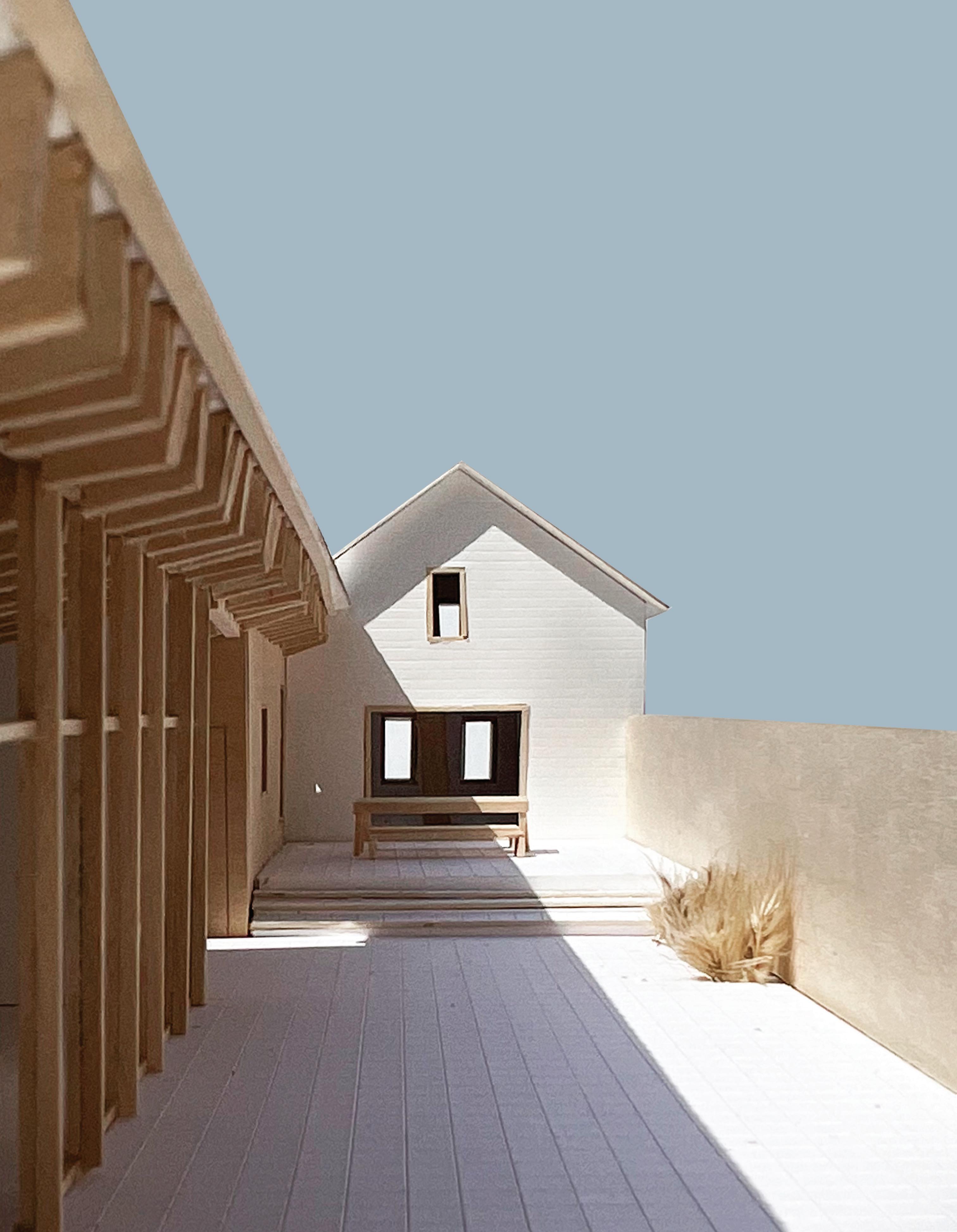 East Hampton, shaped by a rich legacy of artists, has a zoning ordinance that allows for artist studio additions. Peterson Rich Office renovated and expanded an existing house for an artist couple and their two children, adding a shared artist studio, expanded living quarters, and a pool. The use of wood in the model represents an addition while the existing house is shown in white.