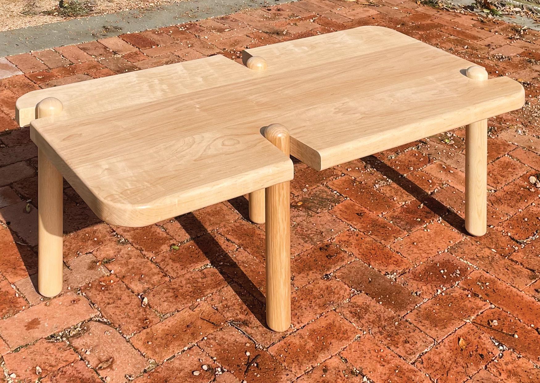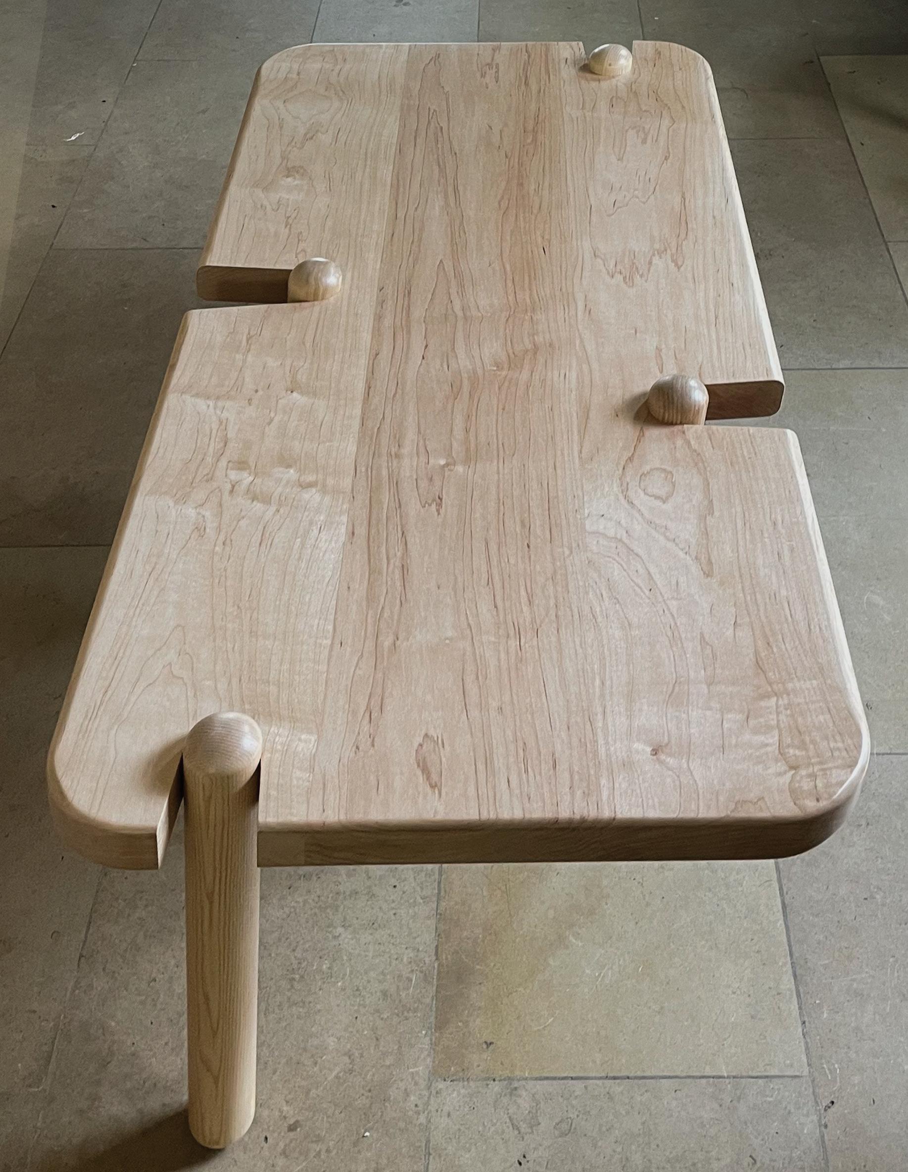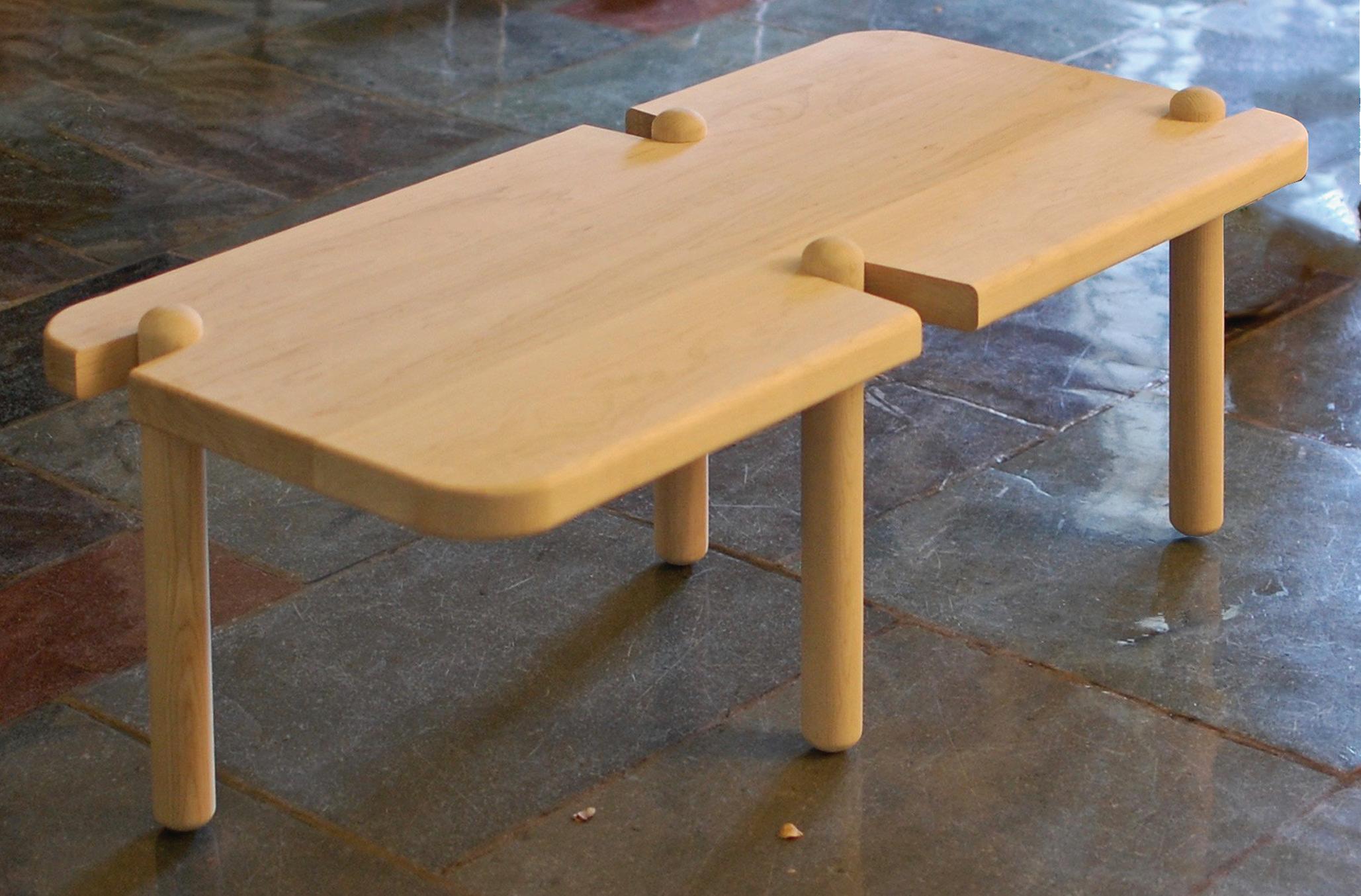 This project playfully explores the most basic components of a coffee table – a table top and four legs. The connection of these elements is dramatized as an intrusion to the tabletop. The typical relationship between table and legs is distorted both by the irregular leg placement and the joint connecting the two. The hard maple table top is softened by the use of a roundover to manufacture a sense of elasticity, emphasized by the change in the roundover diameter of the edges on the long sides as opposed to the short sides. The legs are rounded at the top and bottom and notch into the table top at varying depths. Their uneven placement pinches the table on each of its sides, subverting the typical arrangement and creating tension across the table. This composition enhances the overall sense of elasticity. Without introducing unfamiliar elements, the standard coffee table’s components are re-contextualized to be more playful.