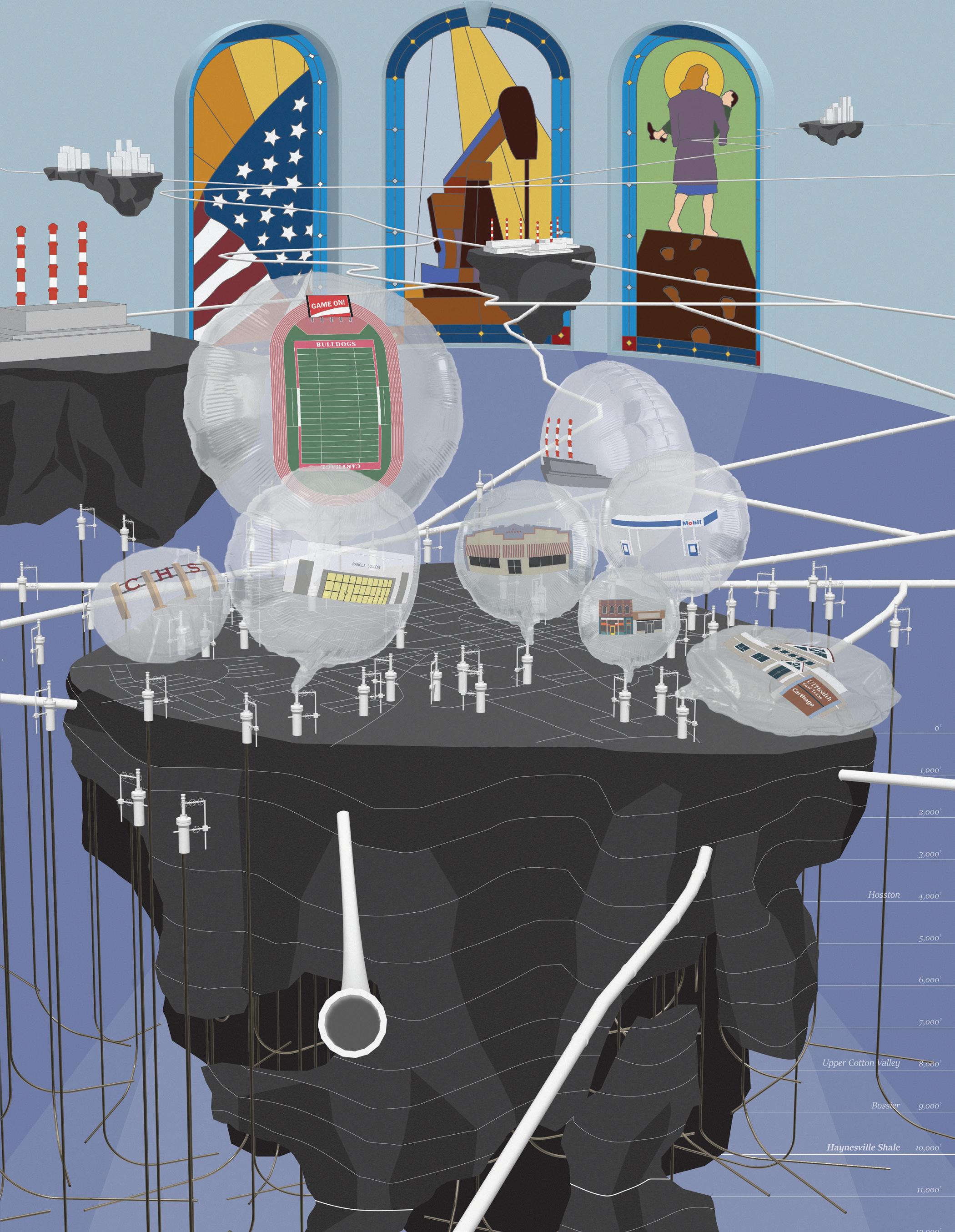 Tasked with exploring the effects of capitalism in small town America, this speculative narrative and subsequent design proposal emerged from research into Carthage, Texas. Carthage’s boom-and-bust history as an oil and gas town has stripped many of its residents of ownership of their mineral rights, clashing with the proud culture of private ownership. The speculation dramatizes the exploitation of small towns by oil companies as a magnified reflection of existing legal, economic and cultural conditions.