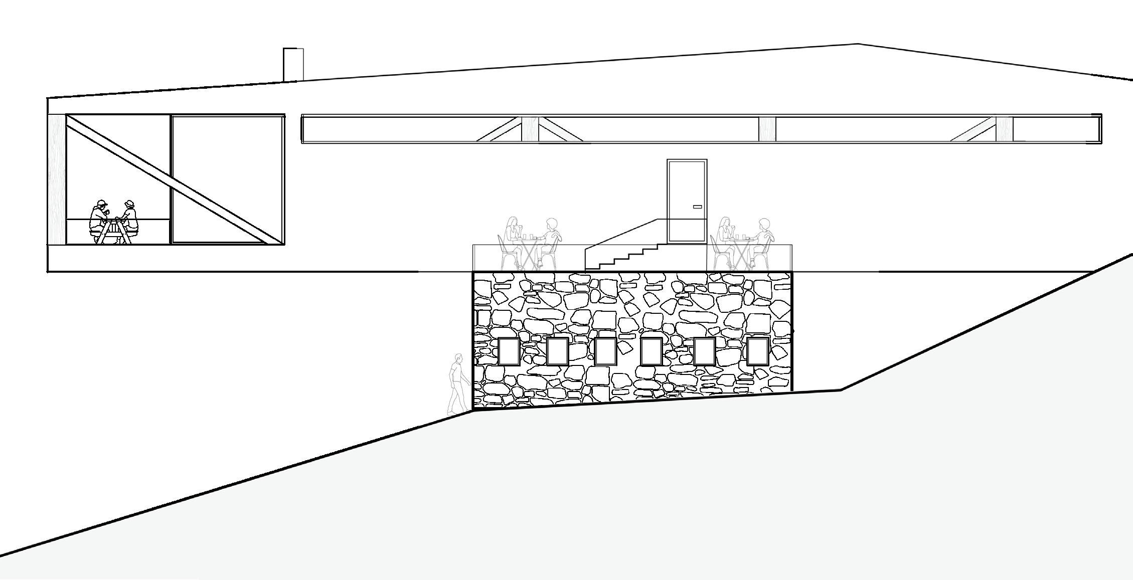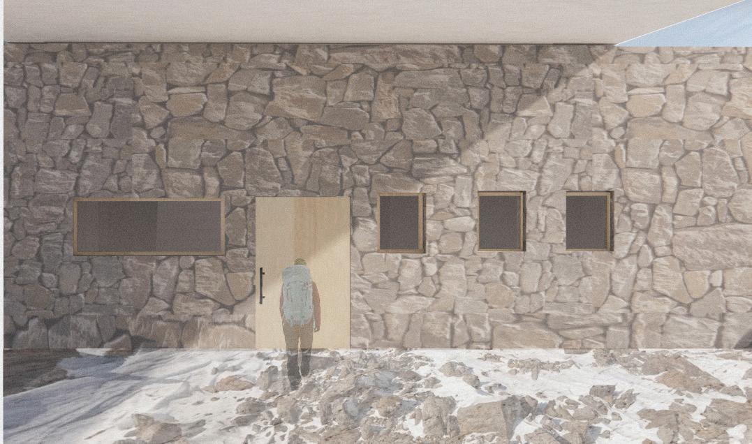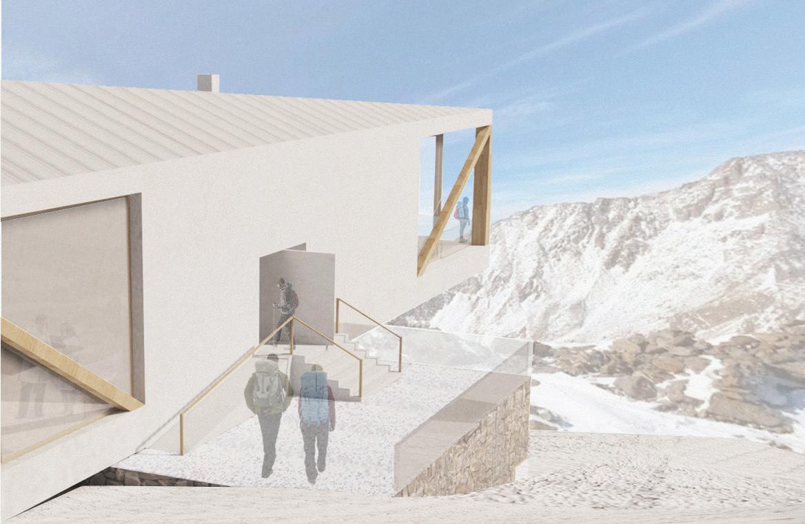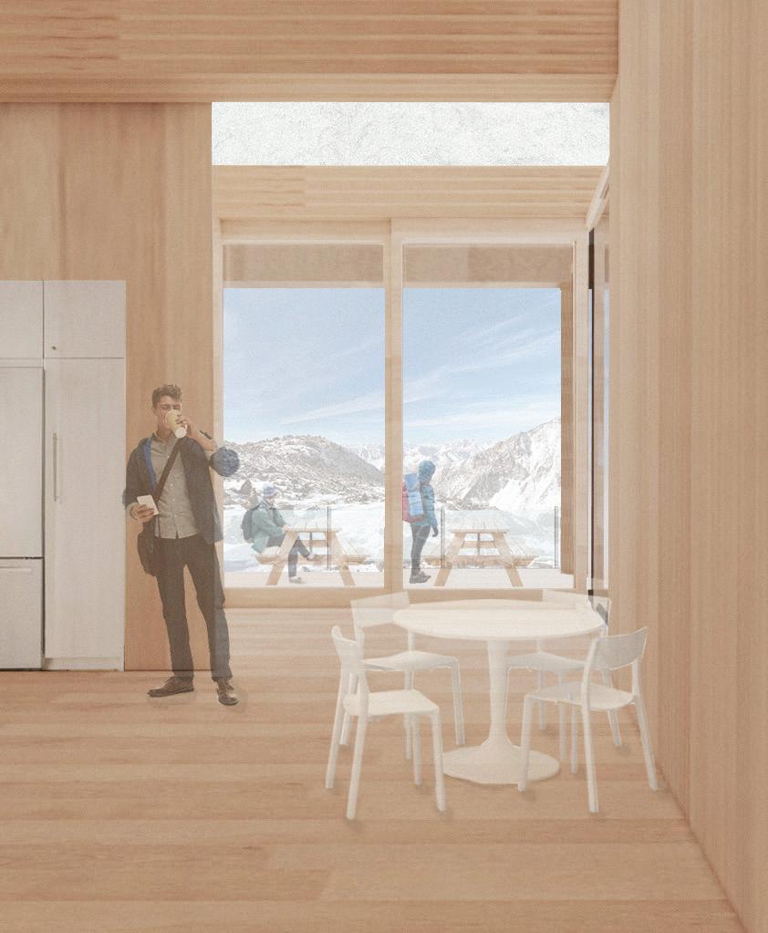 Sturdy and sheltered, the stone base houses researchers in private rooms and hikers in a shared bedroom. The cantilever contains a spacious kitchen and shared dining area for hikers and scientists, as well as labs and offices for glacier research. The dramatic gesture of the cantilever enables intimate views of the mountains surrounding the project. Visual connection to the surrounding landscape complements and vivifies research undertaken in the labs, while the large balcony creates a magnificent backdrop for hikers and scientists dining outdoors.