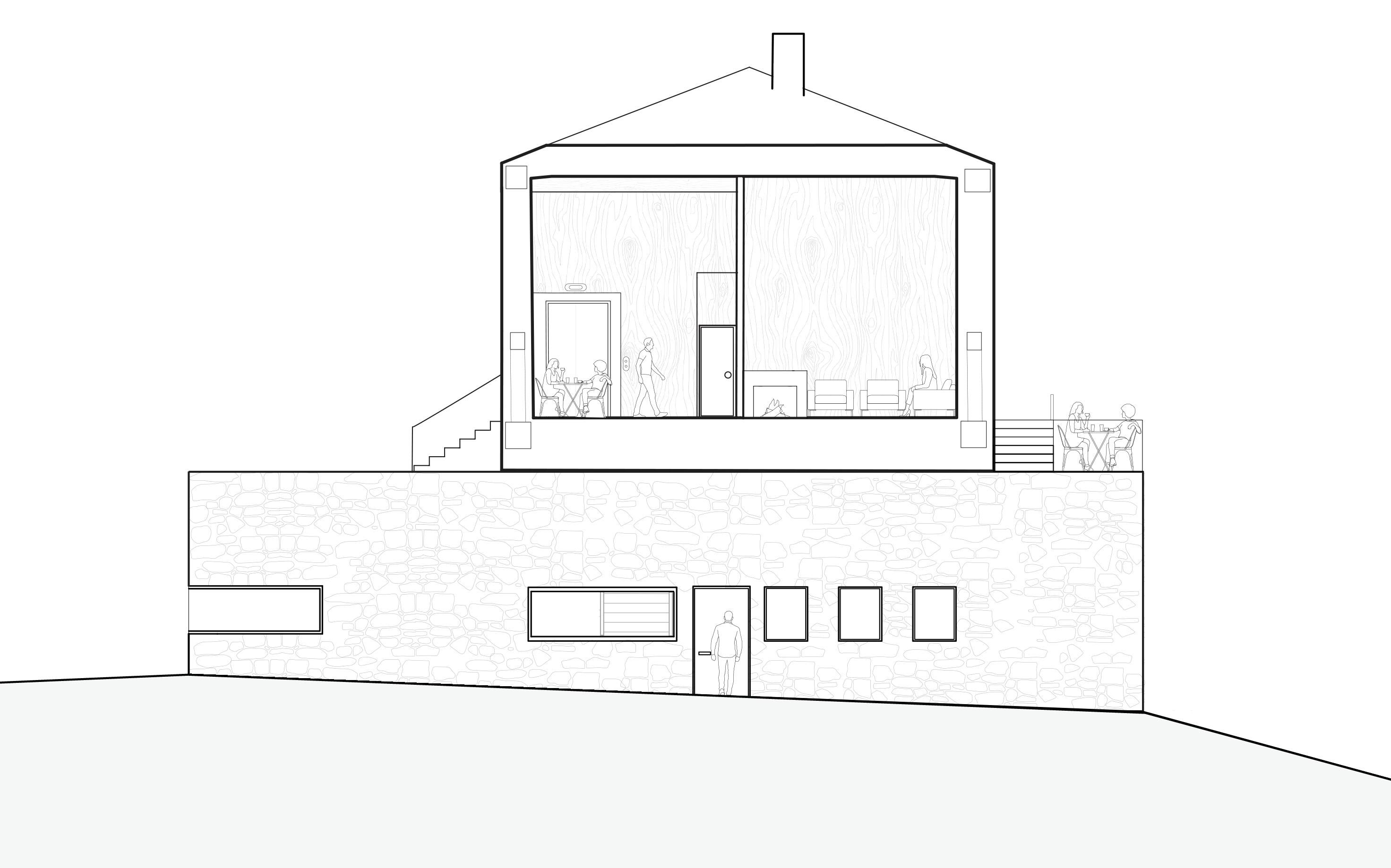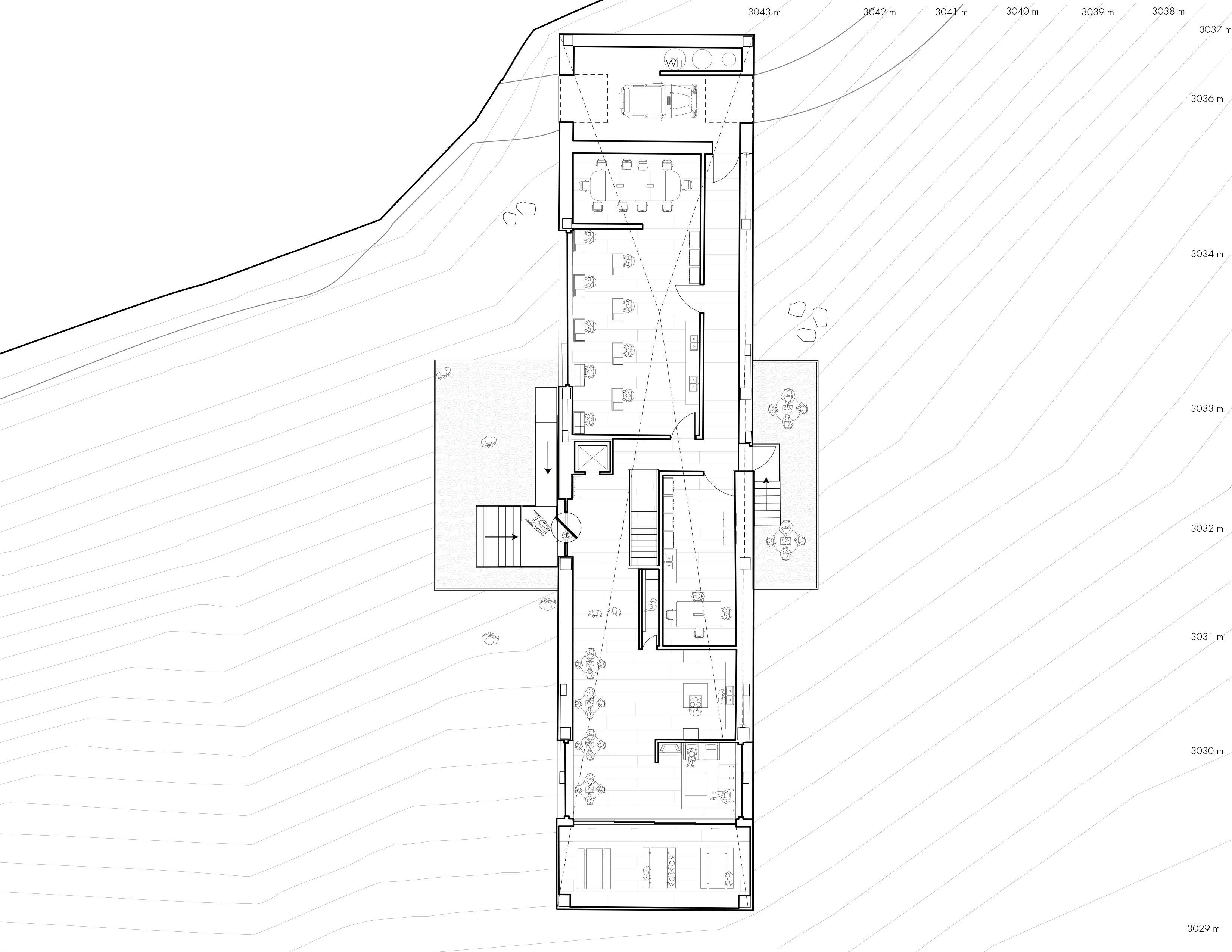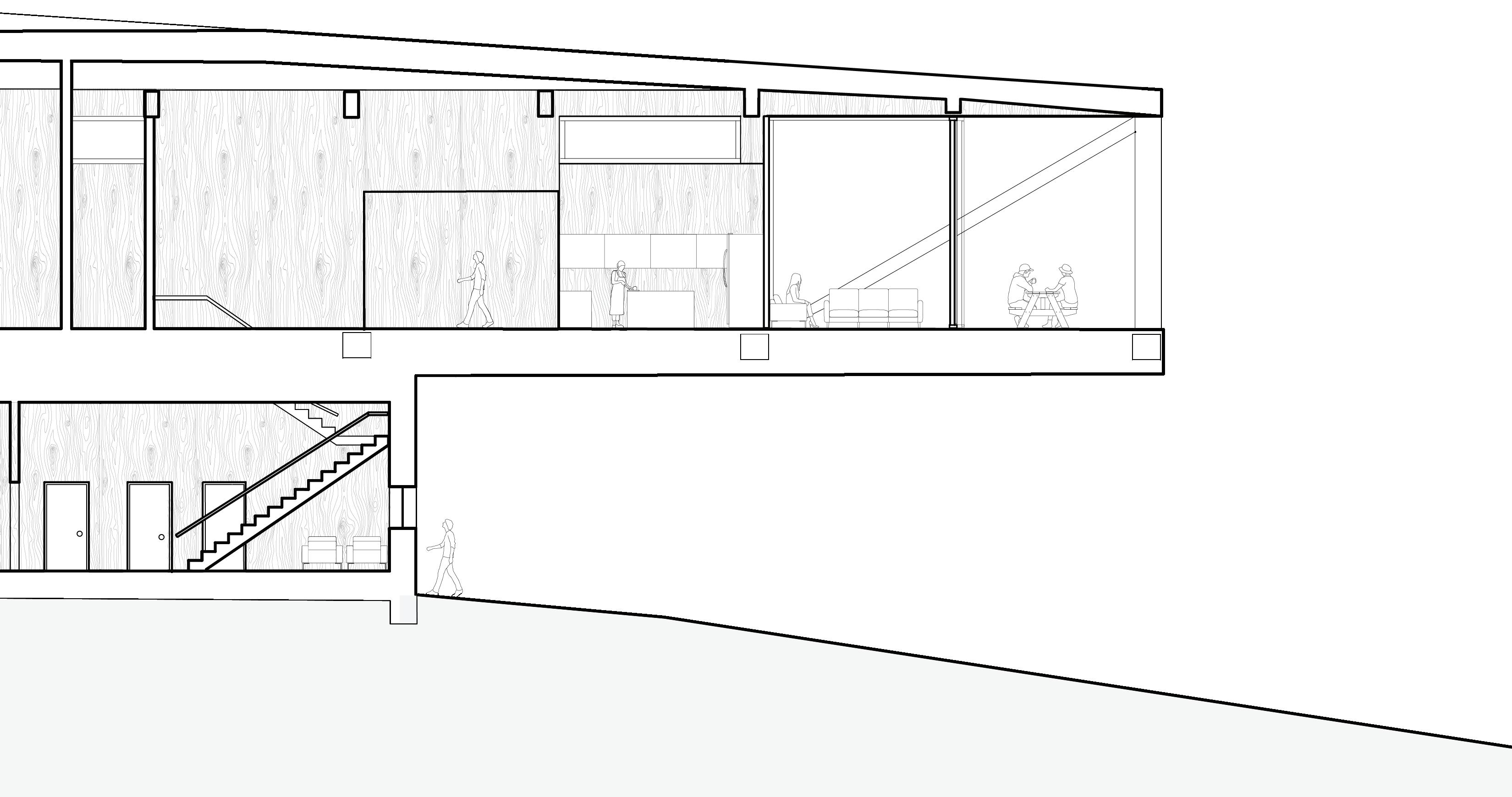 Sturdy and sheltered, the stone base houses researchers in private rooms and hikers in a shared bedroom. The cantilever contains a spacious kitchen and shared dining area for hikers and scientists, as well as labs and offices for glacier research. The dramatic gesture of the cantilever enables intimate views of the mountains surrounding the project. Visual connection to the surrounding landscape complements and vivifies research undertaken in the labs, while the large balcony creates a magnificent backdrop for hikers and scientists dining outdoors.