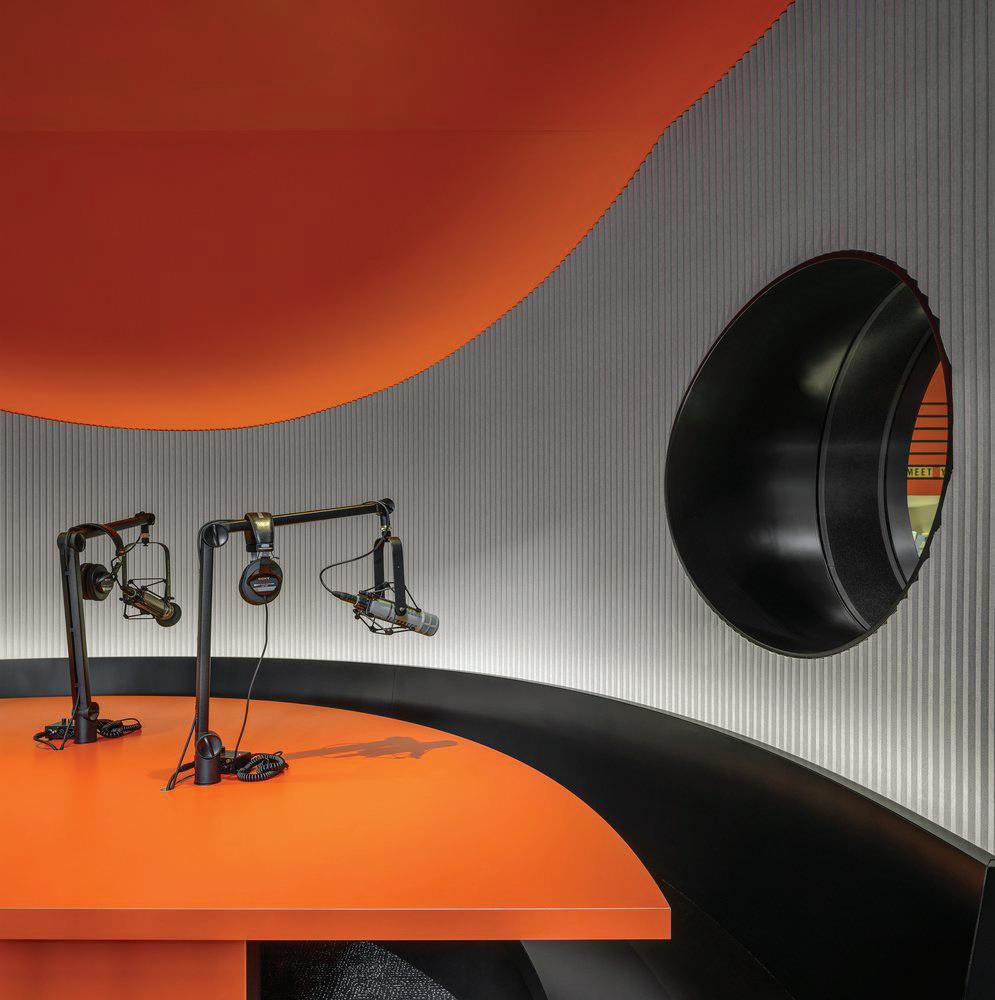 Above: Schematic floor plan; Below: Detail section of podcast studio bench