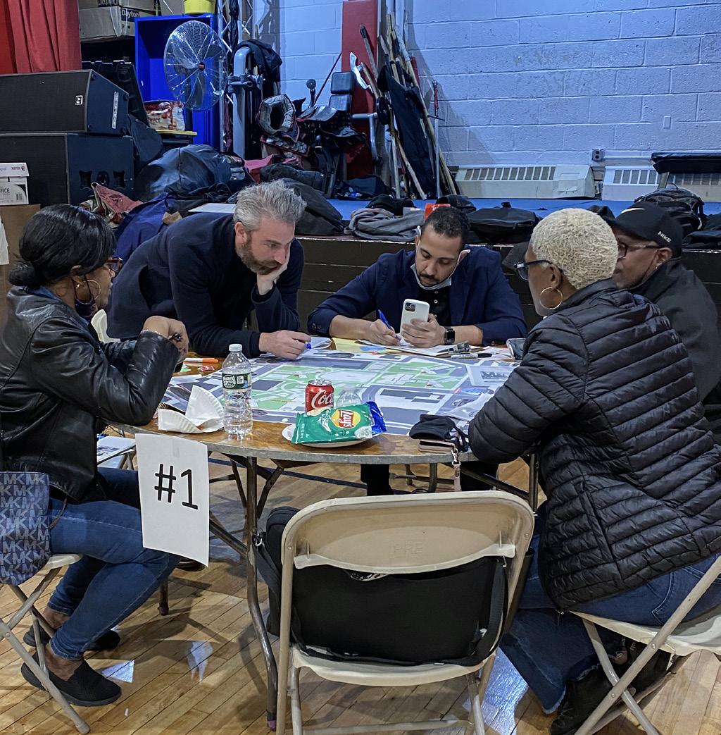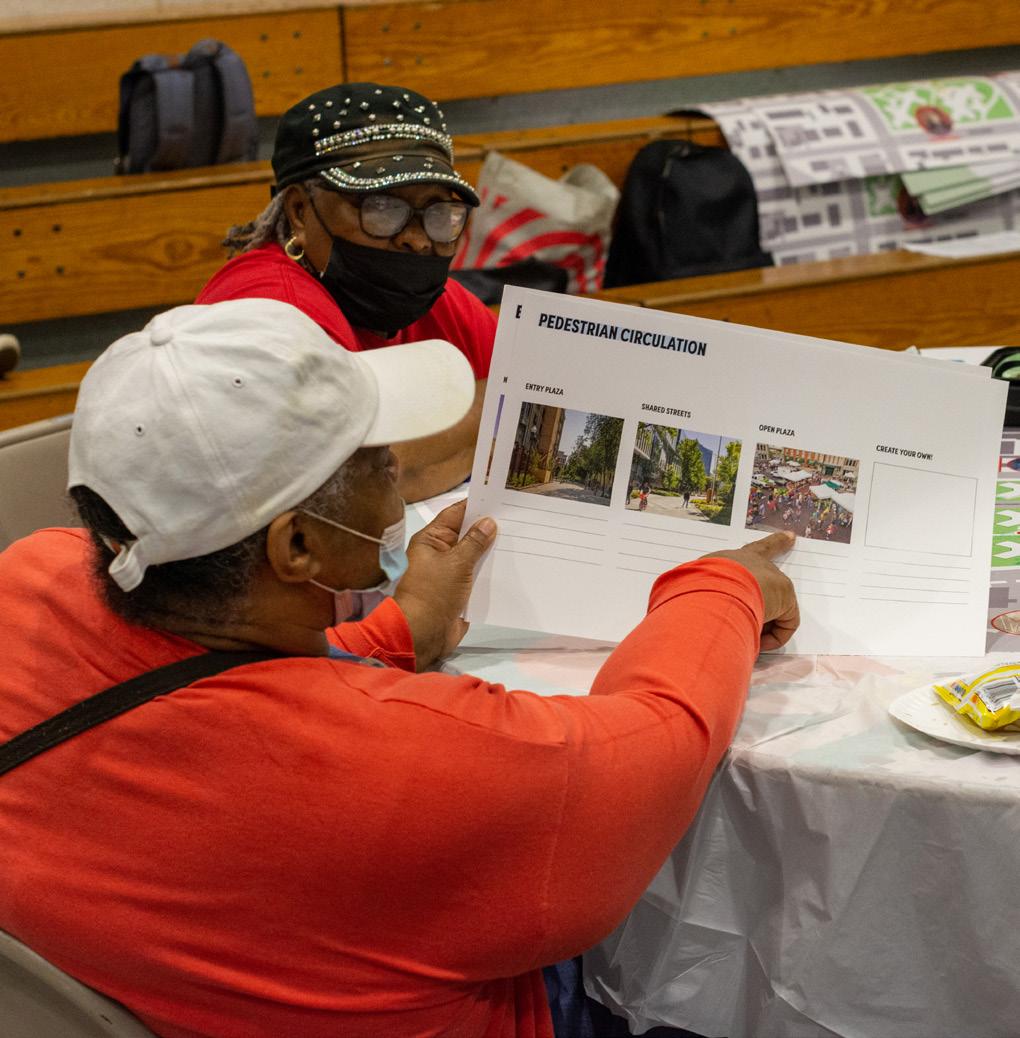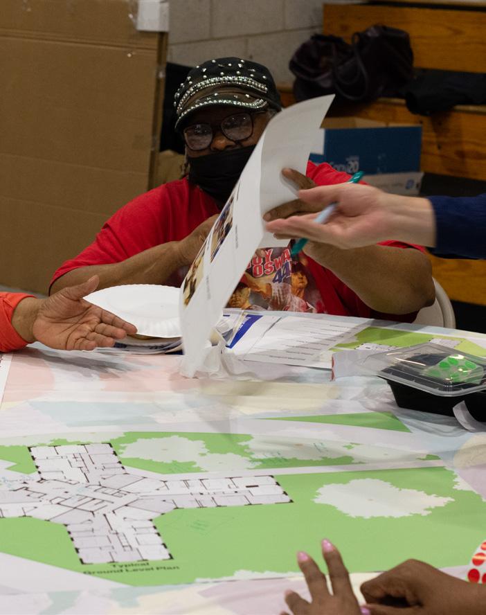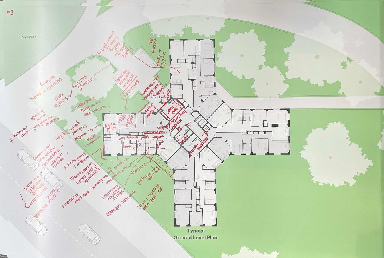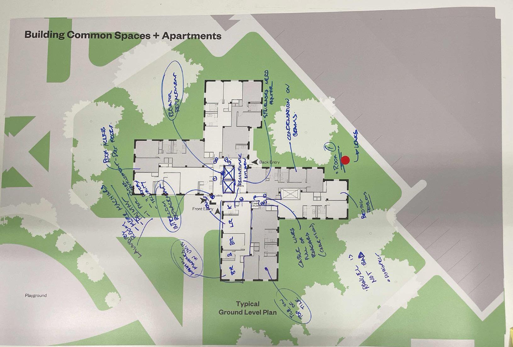 The second activity asked residents and facilitators to work together and envision improvements to the site and grounds of their campus. Using the same map, facilitators used markers to sketch solutions to some of the areas of concern and opportunity identified in the first activity.