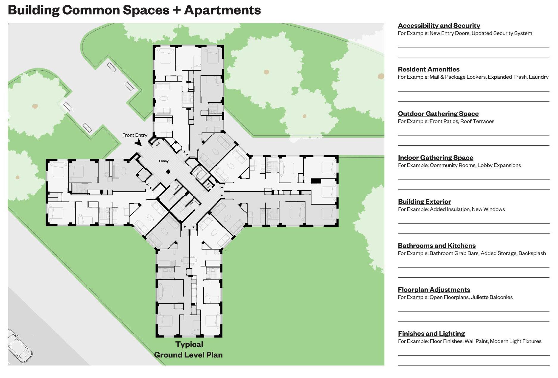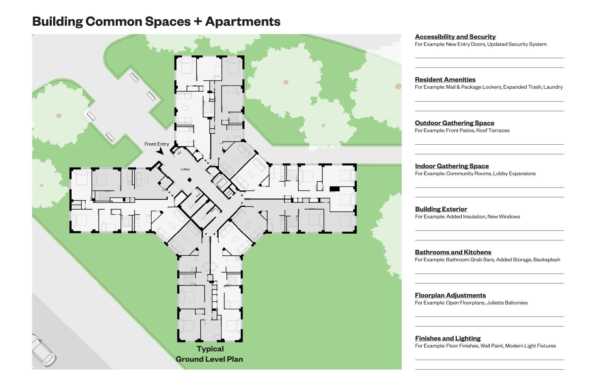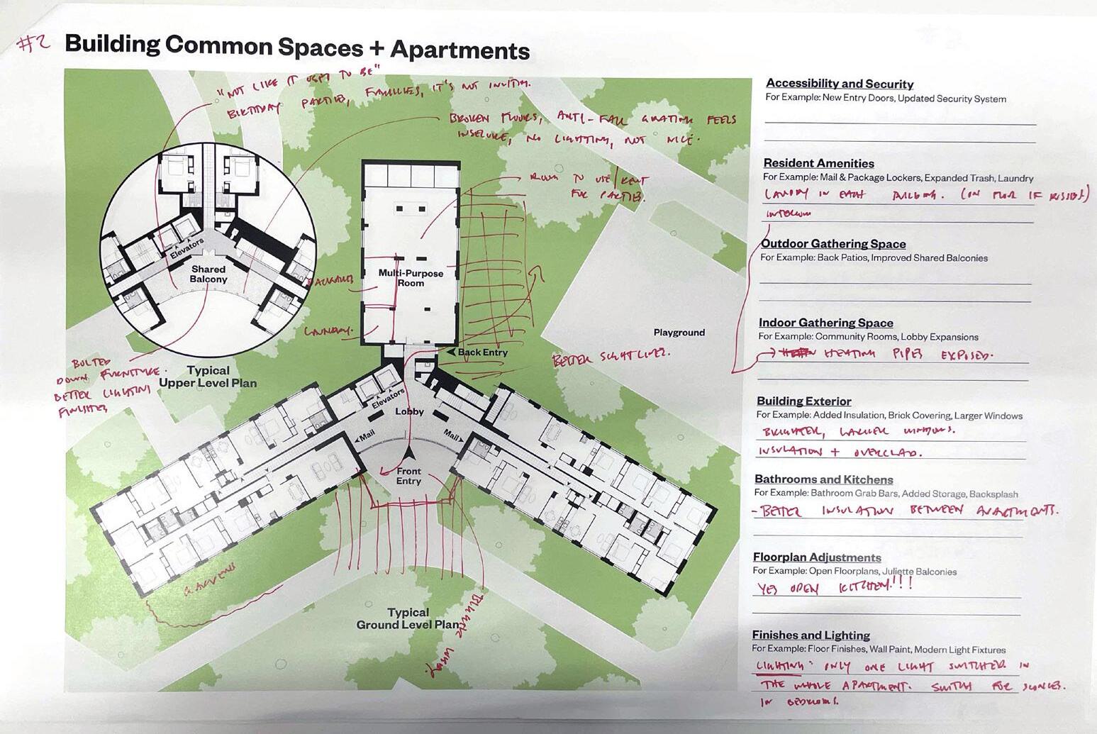 The third and last activity asked residents and facilitators to work together to envision improvements to the building common spaces and apartment interiors. Using the categories listed on the worksheets as a guide, residents and facilitators sketched solutions to address areas of concern and opportunity on the plan.