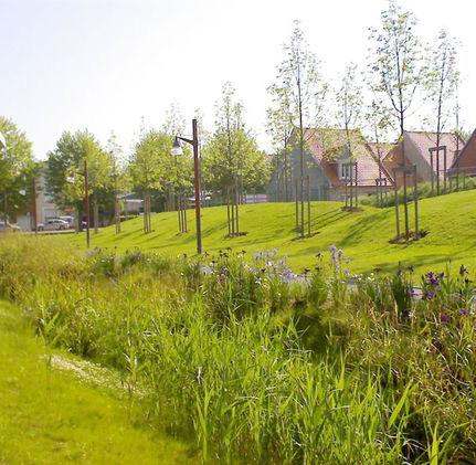 Control Flooding Threats with a Resilient Landscape through alterations in grade that direct water to a central flood catchment zone at the existing topographical low point and interspersed bioswales.