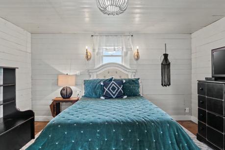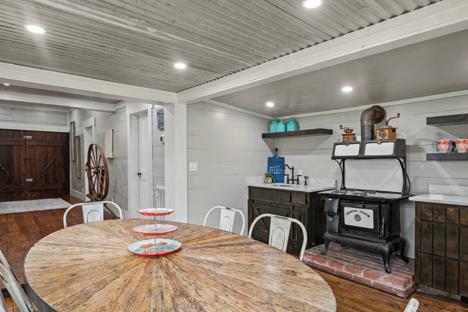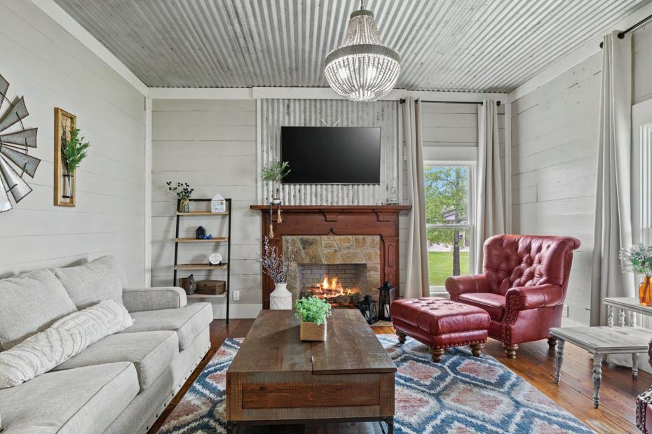 Enter through the massive doors down the “shot-gun” hallway. Stay a while in the inviting living room featuring a wood-burning fireplace and expansive windows that flood the space with natural light. The cozy kitchen with period replica appliances and dining area provide a charming setting for intimate meals or morning breakfasts. Retreat to the primary bedroom with an ensuite bath, ensuring a tranquil end to your day. A second bedroom and hall bath offer privacy for guests.