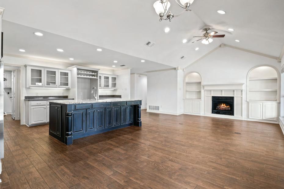 The gourmet kitchen is a culinary delight, featuring sleek stainless-steel appliances, abundant cabinetry, and a grand oversized island perfect for casual dining. Unwind in the inviting living room with a cozy fireplace and custom built-ins, ideal for relaxation and entertainment. The primary suite beckons with French doors opening to a private oasis, complete with a spa-like ensuite bathroom with a tile shower, soaking tub, dual sinks, and spacious walk-in closet. Three guest rooms offer ample accommodation, including a jack and jill bath for convenience. Upstairs, a versatile flex space with a wet bar sets the stage for a game or media room.