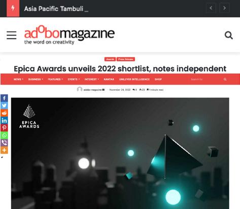 Jury includes: +Design (GR) • AdAsia (SG) • adbusiness (GR) • Adformatie (NL) • Adland (US) • Adobo Magazine (PH) • Advertology (RU) • Adweek (US) • AR/VR Magazine (US) • ArabAd (LB) • Best-Marketing (EE) • Bizcommunity (ZA) • Brain (JP) • Brain Taiwan (TW) • Brand Buffet (TH) • Brand News (IT) • Branding in Asia (US) • BrandPackaging (US) • Brief.pl (PL) • Briefing (PT) • Bulb! (CL) • Business Insider (USA) • Campaign (UK) • Campaign Brief (AU) • Campaign India (IN) • Campaign Turkey (TR) • CB News (FR) • CNET (USA) • Código Jan-Ken-Po (PE) • COLOURlovers (IL) • Cominmag (CH) • Communicate (UAE) • Communication Arts (US) • Creative Review (UK) • Culture Pub (FR) • Dagens Media (SE) • Digital Production (DE) • Digital Synopsis (IN) • elmaaltshift (TR) • Entrepreneur Magazine (USA) • exchange4media (IN) • Extradienst (AT) • FONK Magazine (NL) • Forbes (USA) • Grenier aux nouvelles (CA) • Horizont (DE) • Horizont Österreich (AT) • Hot Digital (RU) • IAA MarcommPub (IR) • Influencia (FR) • Infopresse (CA) • InformationWeek (USA) • Insider LATAM (AR) • Joe La Pompe (FR) ) • Kampanje (NO) • Kreativ (HU) • Little Big Animation (FR) • LLLLITL (FR) • Lürzer's Int'l Archive (DE) • M+AD! (NZ) • MAM Marketing&Media (CZ) • MarComm News (UK) • Markedsføring (DK) • Marketing Directo (ES) • Marketing Dive (US) • Marketing Magazin (SI) • Marketing Magazine (MY) • Marketing Türkiye (TR) • Marketing Week (GR) • Marketing365 (MK) • MarketingTribune (NL) • Markkinointi & Mainonta (FI) • MarkLives.com (ZA) • Media in Canada (CA) • Media Marketing (BA) • Media Marketing (MM) (BE) • Mediafeed.pl (PL) • MediaVillage.com (US) • Meedia (DE) • Modern Advertising (CN) • Nature Research (USA) • NC Nuova Comunicazione (IT) • NEO (MX) • New Business (DE) • nieuws.nl (NL) • OOH! (DE) • P&M (CO) • Page One (NG) • Persönlich (CH) • PR Week (UK) • Press (PL) • Professional Photo (UK) • Profit (PAK) • Propmark (BR) • PUB (BE) • Resumé (SE) • RT Russia Today (RU) • Rusbase (RU) • Shots (UK) • SHP+ (CN) • Slanted Publishers (DE) • SocialBeta (CN) • Sostav Ukraine (UA) • Stratégie (SK) • Stratégies (FR) • Strategy (CA) • Tarekchemaly.com (LB) • The Holmes Report (US) • The Stable (AU) • TID & tendenser (DK) • Touchpoint (IT) • VR Today Magazine (DK) • Werben & Verkaufen (DE) • Werbewoche (CH) • Worldofad.asia (KZ)