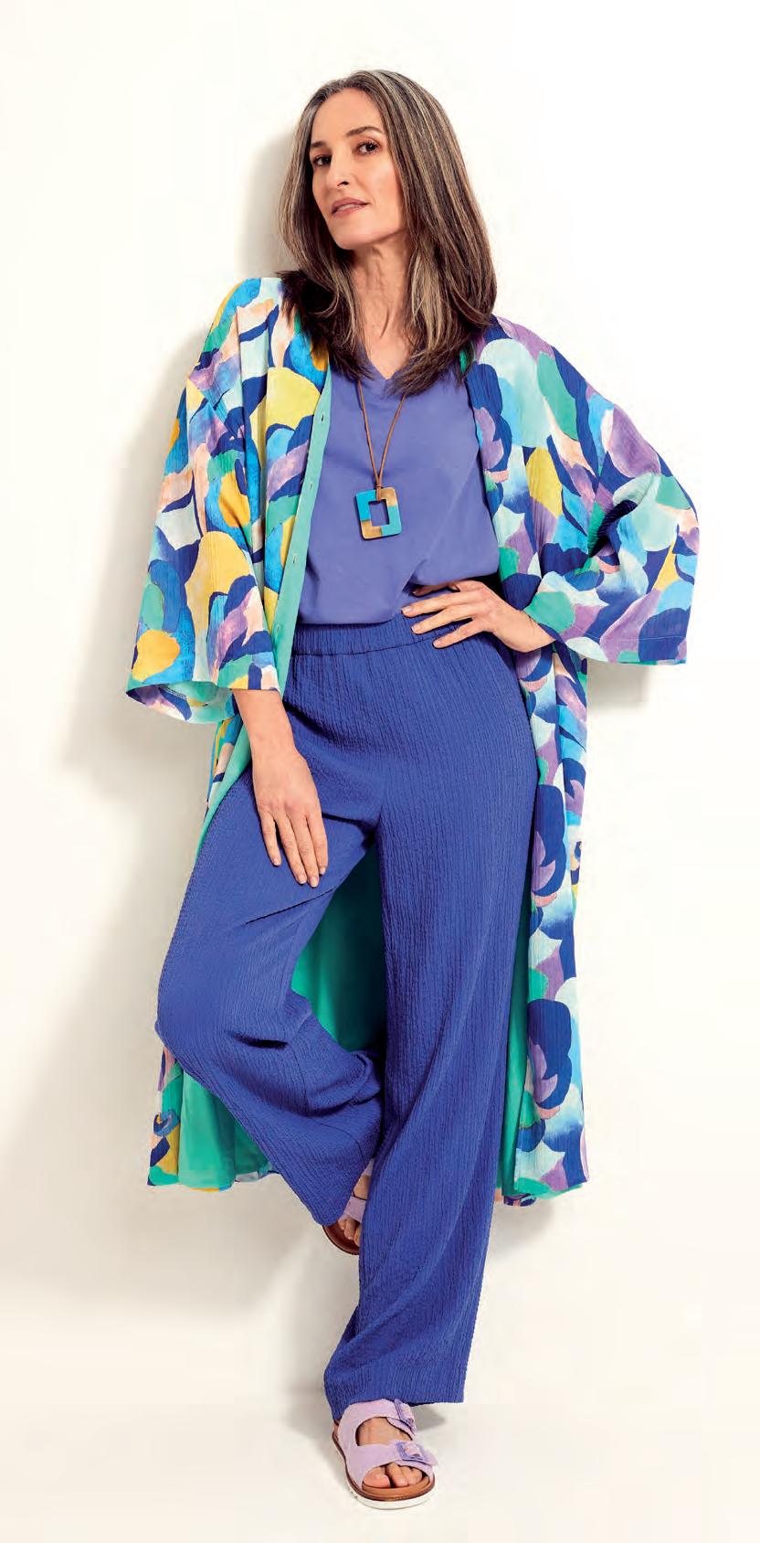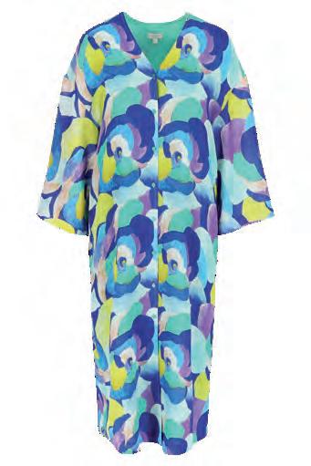 Robe-chemise surdimensionnée ? Kimono ? Ce joli vêtement en voile froissé aux manches larges et basses remplit ces deux fonctions. Nous l’adorons à cause de son imprimé aquarelle coloré, la grande liberté de mouvement qu’il offre et sa doublure contrastée et antistatique. Ses petits boutons en nacre verte signés sont un détail sympa.