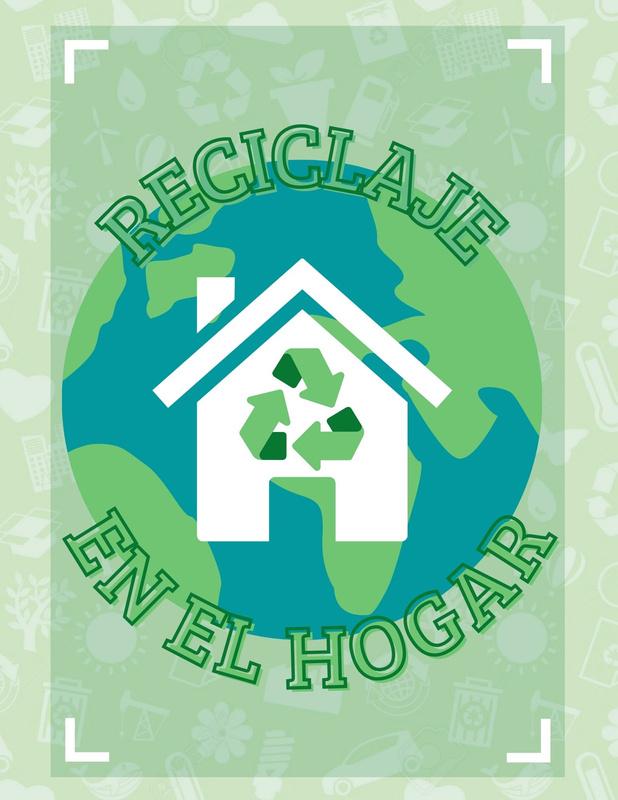Denotación: Fondo con iconos de reciclaje, por encima un marco con cierta transparencia, unmundoelcualtieneunacasa, un símbolo de reciclaje, en la parte del borde del mundo un texto