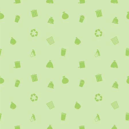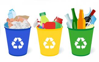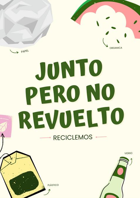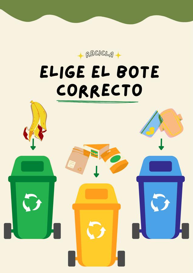 Denotación Botes de basura de 3 colores distintos, símbolos de reciclaje, ilustraciones de basura, orgánica, plástica y papel, fondo color beige con decoracionesenverde.