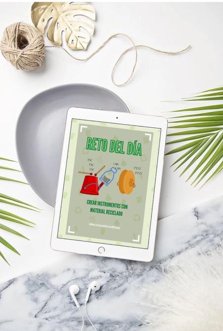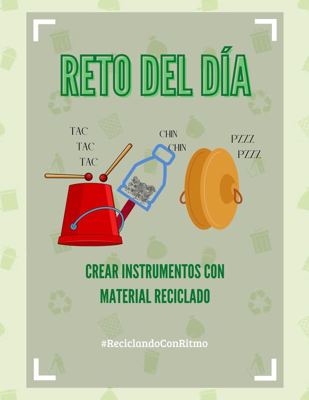 Denotación: Fondo color blanco hueso con elementos de reciclaje, encima un marco semi transparente, contiene una ilustración de simulación de instrumentos con material reciclado Cada elemento con su sonido que lo identifica, un título en la parte superior y una frase en la parte inferior, junto a unhashtag Connotación: Podemos ponernos a prueba y experimentar cosas que beneficiaran nuestras capacidades y mejoraran el ambiente.