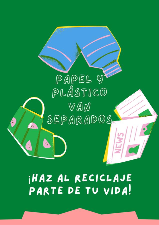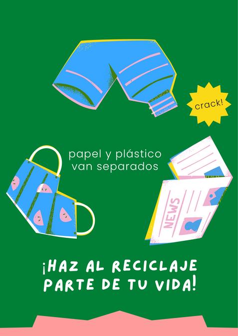 Denotación Ilustraciones de botellas de: botellas de plástico,periódicoymascarilla, fondo en color verde, circulo con picos en amarillo y texto ennegro,fraseencolorblanco, decoraciónencolorrosado Connotación: Se indica que estos 2 elemetos van por separado y estas ilustraciones seunenparaformarelsímbolo delreciclajecreanunaimagen llamativaydistinta