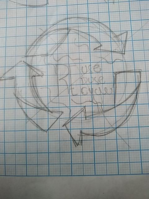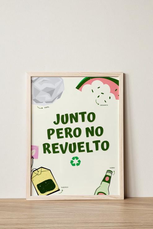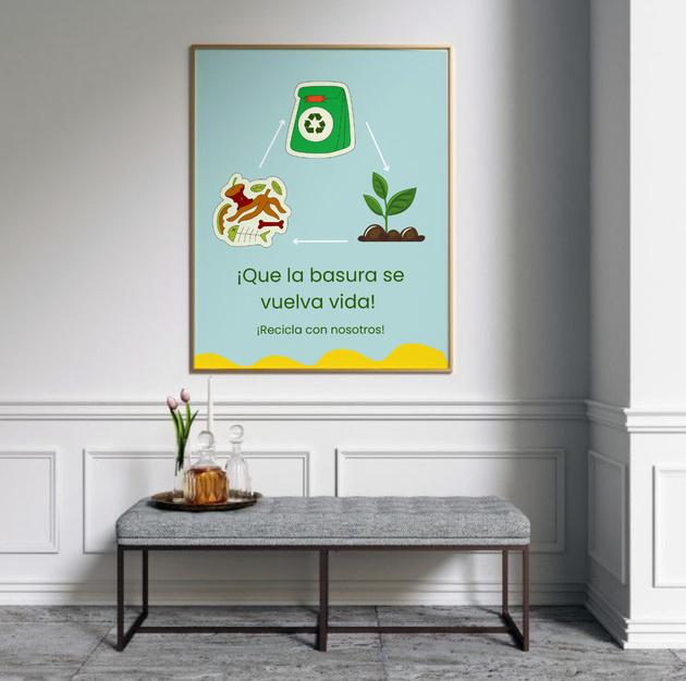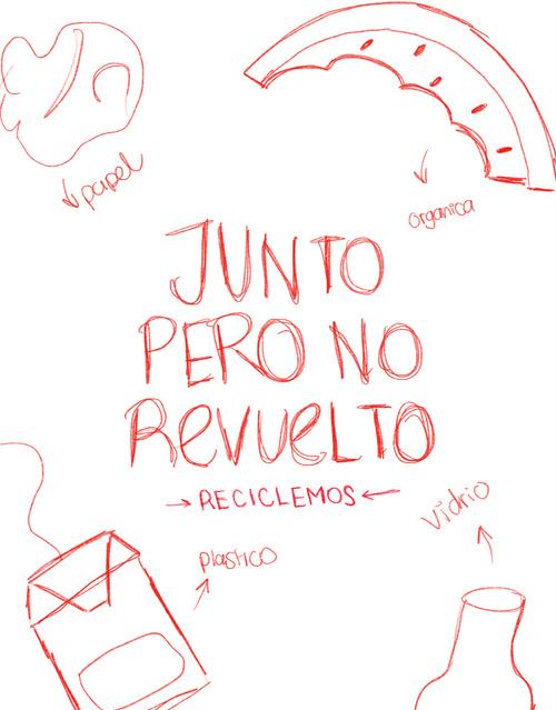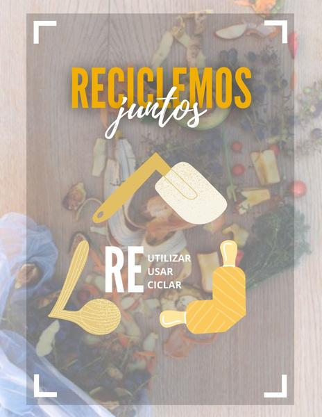 Denotación:Fondocondesechos alimenticios, un marco transparente, el símbolo de reciclaje hecho con utensilios de cocina, en medio las 3R que identificanelreciclaje,yuntítulo. Connotación: Saber que desechos poder reciclar o reutilizarlosparaabonos.