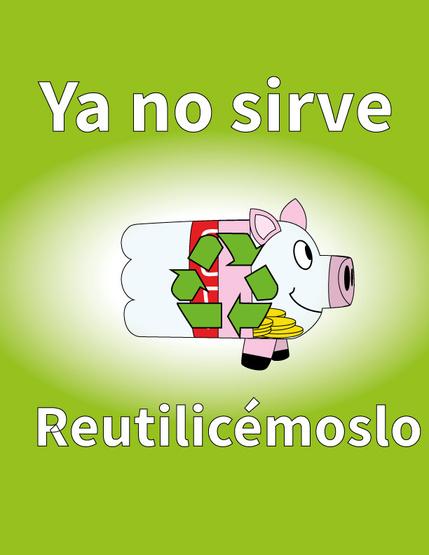 principal tenemos una botella mitad usada mitad alcancía, Tipografía blanca y un fondo verde con un degrade blanco para resaltar el símbolo de reciclajeyalcancía.