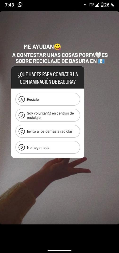 Según la encuesta un 2632% votó que si recicla en su hogar, así mismo el 5.26% votó que participan como voluntarias en centros de reciclaje Un 526% dice que invitan e inducen a los demás a reciclar. Por otro lado el 10.53% respondióqueno hace nada para reciclar.