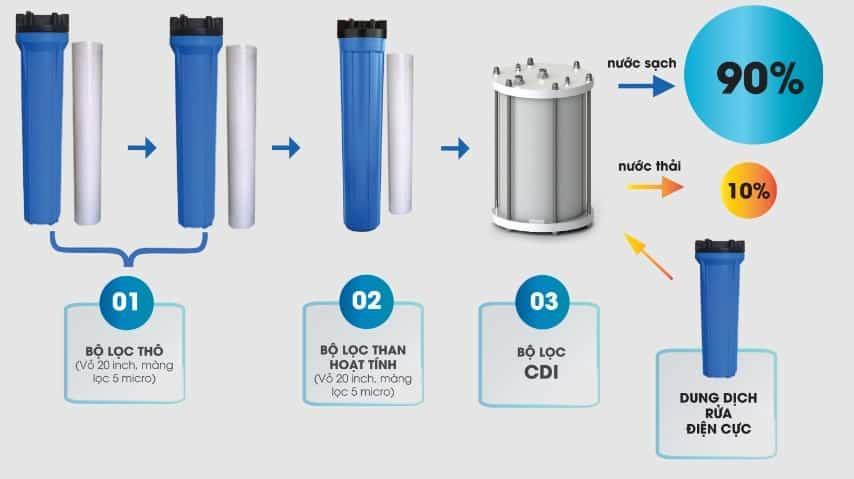 bước: Lọc vật lý, Lọc than hoạt tính, Lọc CDI. Đảm bảo lọc hết vi sinh vật, chất oxy hóa, kim loại nặng, clo dư thừa, chất độc hòa tan, ion âm độc hại,... đồng thời diệt khuẩn và giữ được các khoáng chất tốt cho sức khỏe người sử dụng.