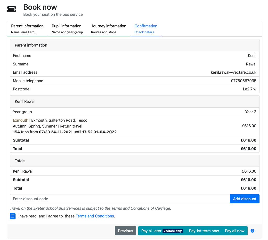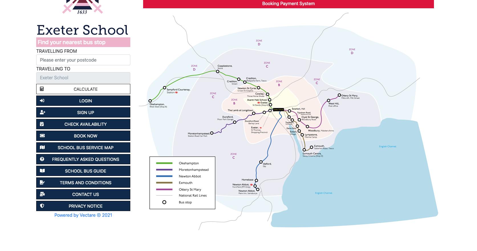All bookings for school routes are made via our online booking system, which can be viewed at exetermaynard.vectare.co.uk. Payment for the service is made at the time of booking and your child’s name will automatically be added to the bus register.