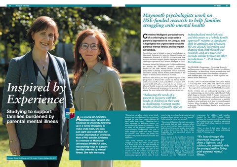 programme for children and families. Funded by the HSE Mental Health Division, the programme is helping develop and evaluate services aimed at supporting the whole family when a parent has mental health issues. “Prior to this, I had never dreamt of attending university, let alone undertaking a PhD,” Christine said.