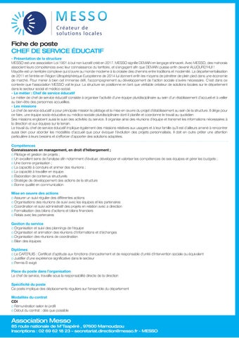 Fiche de poste CHEF DE SERVICE ÉDUCATIF - Présentation de la structure MESSO est une association Loi 1901 à but non lucratif créé en 2017. MESSO signifie DEMAIN en langage shimaoré. Avec MESSO, des mahorais associent leurs compétences avec leur connaissance du territoire, et s’engagent afin que DEMAIN puisse enfin devenir AUJOURD’HUI ! Mayotte est un territoire complexe qui s’ouvre au monde moderne à la croisée des chemins entre traditions et modernité. La départementalisation de 2011 et l’entrée en Région Ultrapériphérique Européenne de 2014 lui donnent enfin les moyens de pénétrer de plein pied dans une économie de marché. Pour mener à bien cet immense défi, l’accompagnement au développement de l’action sociale s’avère nécessaire. C’est dans ce contexte que l’association MESSO voit le jour. La structure se positionne en tant que véritable créateur de solutions locales sur le département dans le secteur social et médico-social. - Le métier : Chef de service éducatif Le métier de chef de service éducatif consiste à organiser l’activité d’une équipe pluridisciplinaire au sein d’un établissement d’accueil et à veiller au bien-être des personnes accueillies. - Les missions Le chef de service éducatif a pour principale mission le pilotage et la mise en œuvre du projet d’établissement au sein de la structure. Il dirige pour ce faire, une équipe socio-éducative ou médico-sociale pluridisciplinaire dont il planifie et coordonne le travail au quotidien Ses missions englobent aussi le suivi des activités du service. Il organise ainsi des réunions d’équipe et transmet les informations nécessaires à la direction et aux équipes sur le terrain. Le travail du chef de service éducatif implique également des missions relatives aux usagers et à leur famille qu’il est d’ailleurs amené à rencontrer aussi bien pour aborder les modalités d’accueil que pour évoquer l’évolution des projets personnalisés. Il doit en outre prêter une attention particulière à leurs besoins et s’efforcer d’apporter des solutions adaptées. Compétences Connaissances en management, en droit d’hébergement ; o Pilotage et gestion de projets ; o Un excellent sens de l’analyse afin notamment d’évaluer, développer et valoriser les compétences de ses équipes et gérer les budgets ; o Une bonne organisation ; o La capacité à conduire et animer des réunions ; o La capacité à travailler en équipe. o Élaboration de contenus structurels o Stratégie de développement des actions de la structure o Bonne qualité en communication Mise en oeuvre des actions o Assurer un suivi régulier des différentes actions o Organisations des réunions de suivi avec les équipes et les partenaires o Coordination et suivi administratif des projets en relation avec a direction o Formalisation des bilans d’actions et bilans financiers o Relais avec les partenaires Gestion du service o Organisation et suivi des plannings de l’équipe o Organisation et animation des réunions d’informations et d’échanges o Organisation des réunions de coordination o Bilan des équipes Diplômes o Le CAFERUIS : Certificat d’aptitude aux fonctions d’encadrement et de responsable d’unité d’intervention sociale ou équivalent o Justifier d’une expérience significative dans le secteur o Permis B exigé Place du poste dans l’organisation Le chef de service, travaille sous la responsabilité directe de la direction Spécificité du poste Ce poste implique des déplacements réguliers sur l’ensemble du département Modalités du contrat CDI o Rémunération selon le profil o Début du contrat : dès que possible