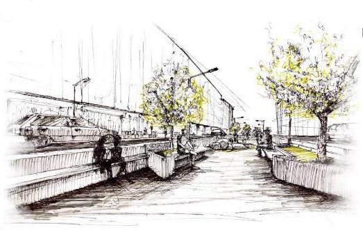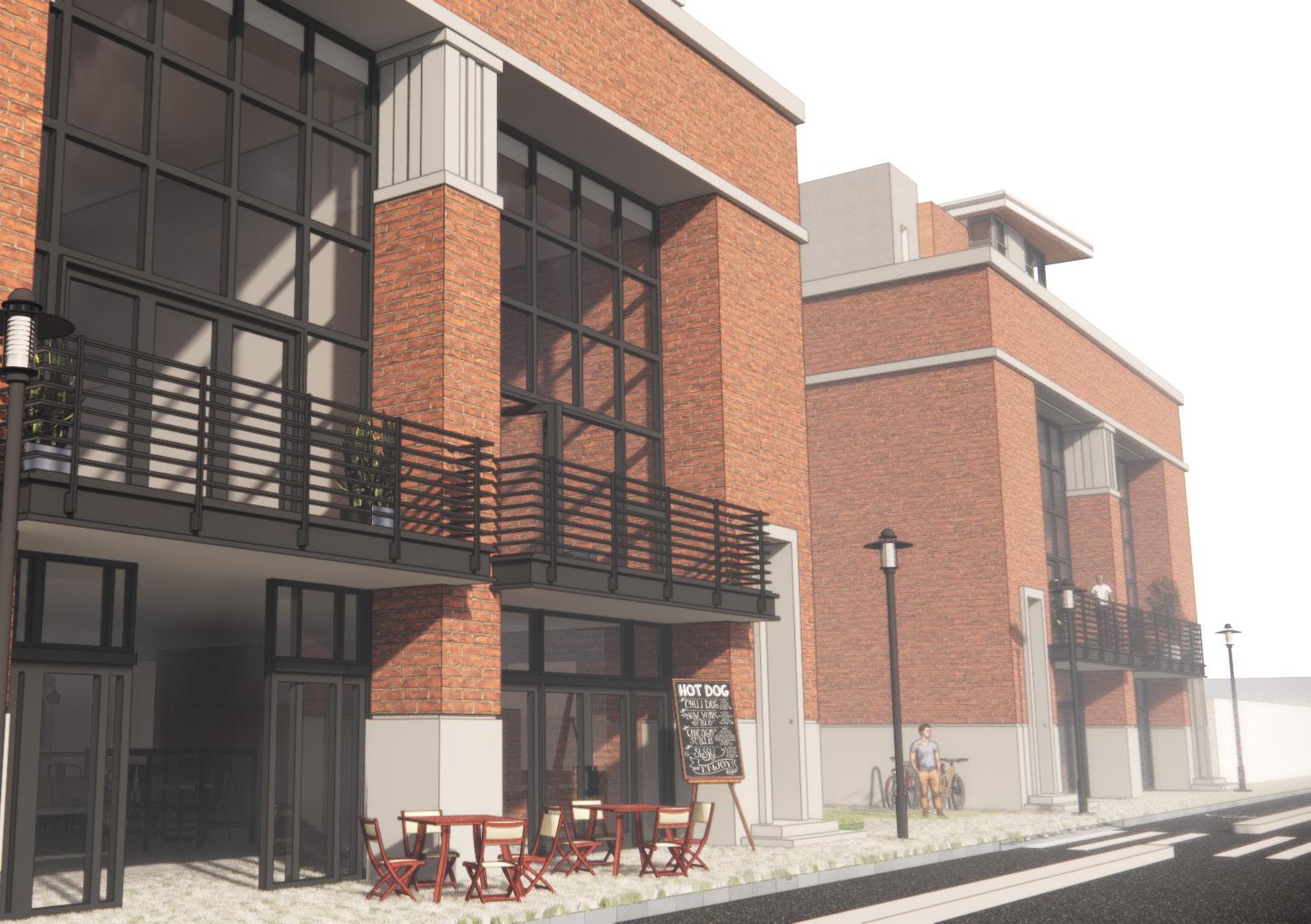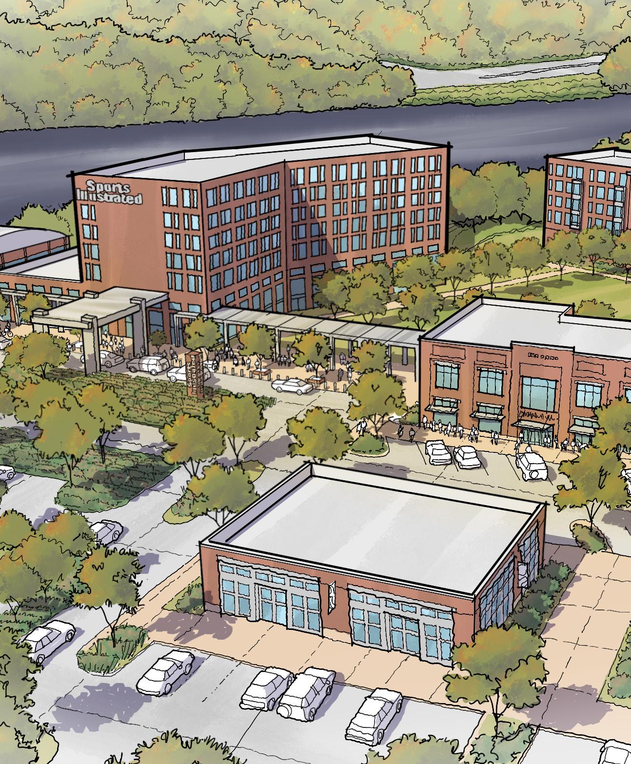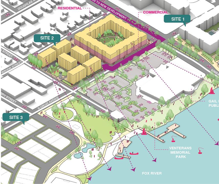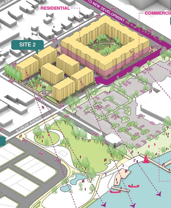 Site 1 - Envisioning a midrise residential building along with a riverfront food truck plaza on a 2.5acre site. Proposing 4 to 5 story residential building with up to 200 units, a promenade for public river access, and activated streetscapes with commercial opportunities.