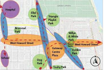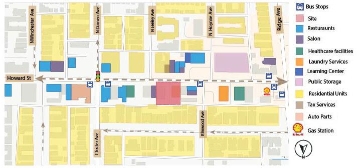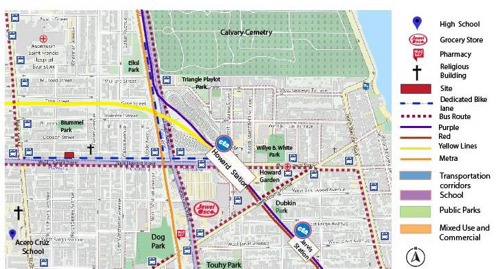 Strategically located near the CTA Howard station, the project provides seamless access to the Red, Blue, and Purple lines, Metra services, and a network of bus stops along major transportation corridors. The development emphasizes pedestrian and cyclist accessibility with dedicated bike lanes and proximity to local amenities, including restaurants, salons, tax services, grocery stores, schools, healthcare facilities, and parks.