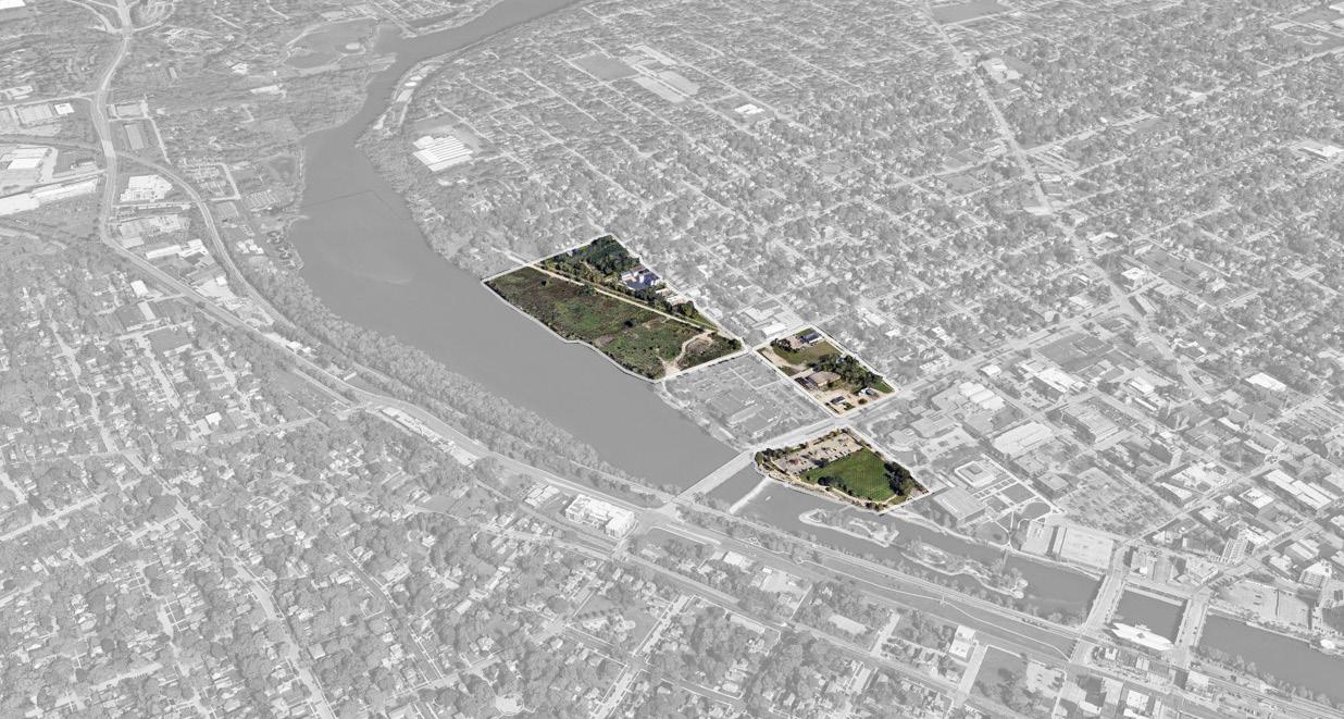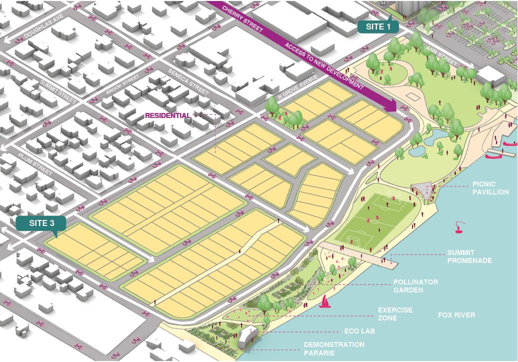 Site 3 - A residential neighborhood along a 9.25-acre linear riverfront park. The park will feature ecofriendly amenities and river access for recreation, integrating nature and community spaces.