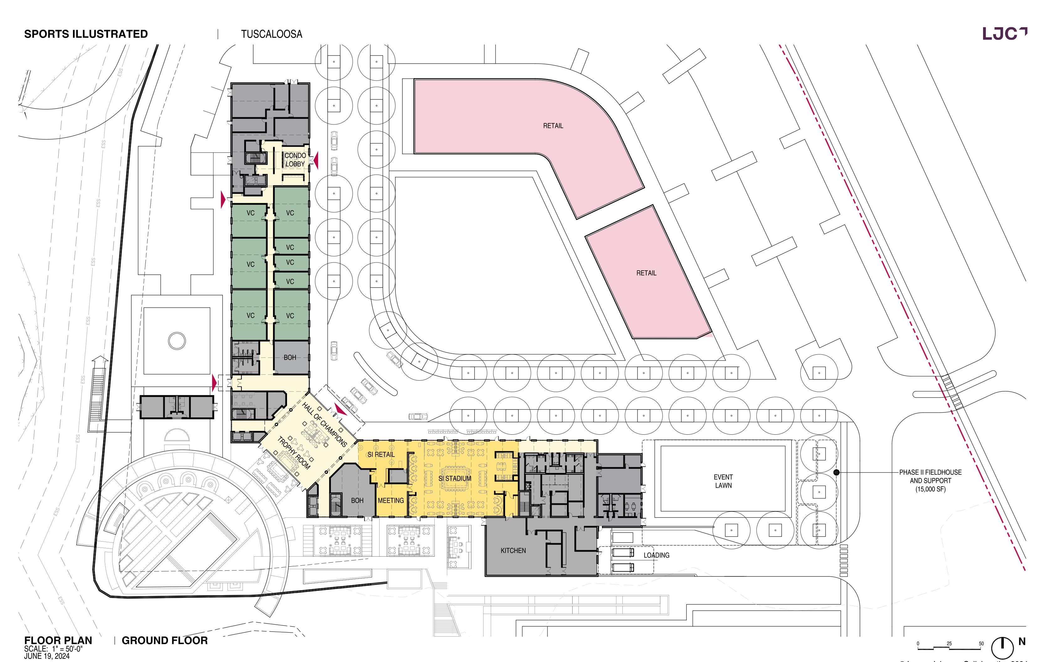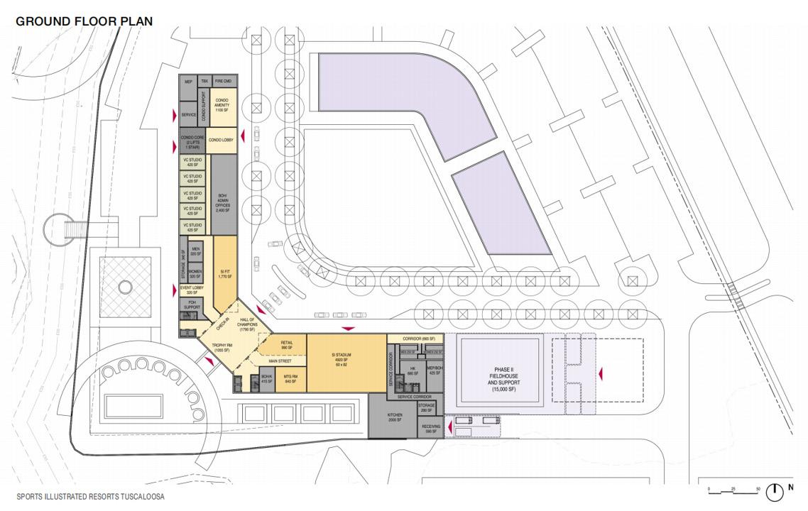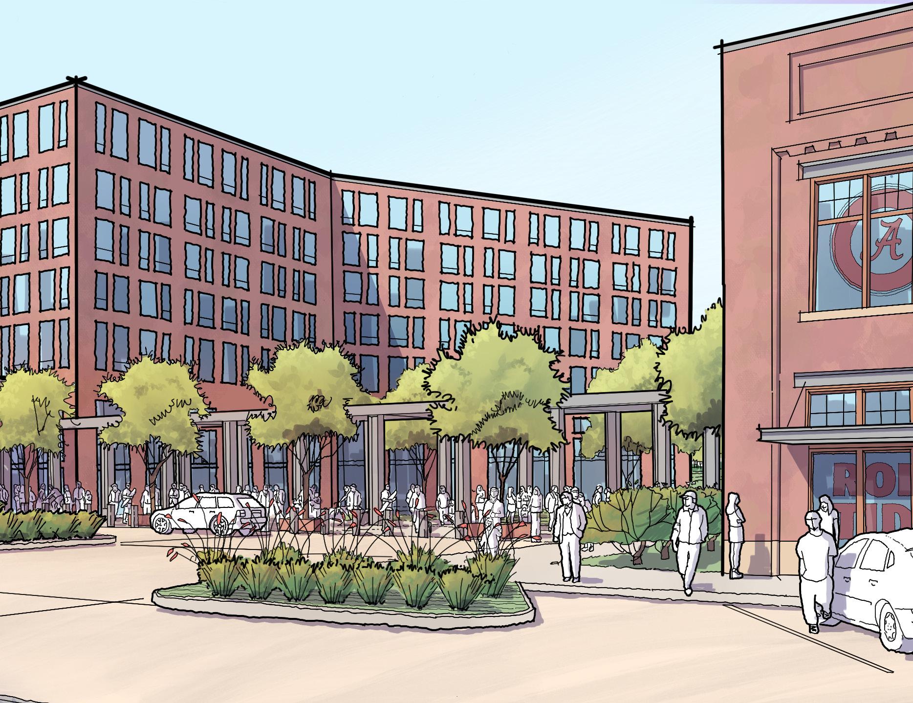 The vision is to create a vibrant resort that serves active lifestyles, attracts sports enthusiasts, and engages the broader Tuscaloosa community. The collaboration involves designing key structures like the SI Hotel, a high-rise with 150 rooms; a mid-rise condo and vacation club; and additional amenities such as a pool, cabana, fitness center, and a central services building.