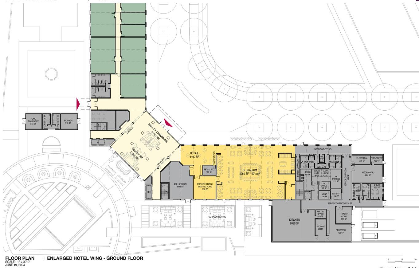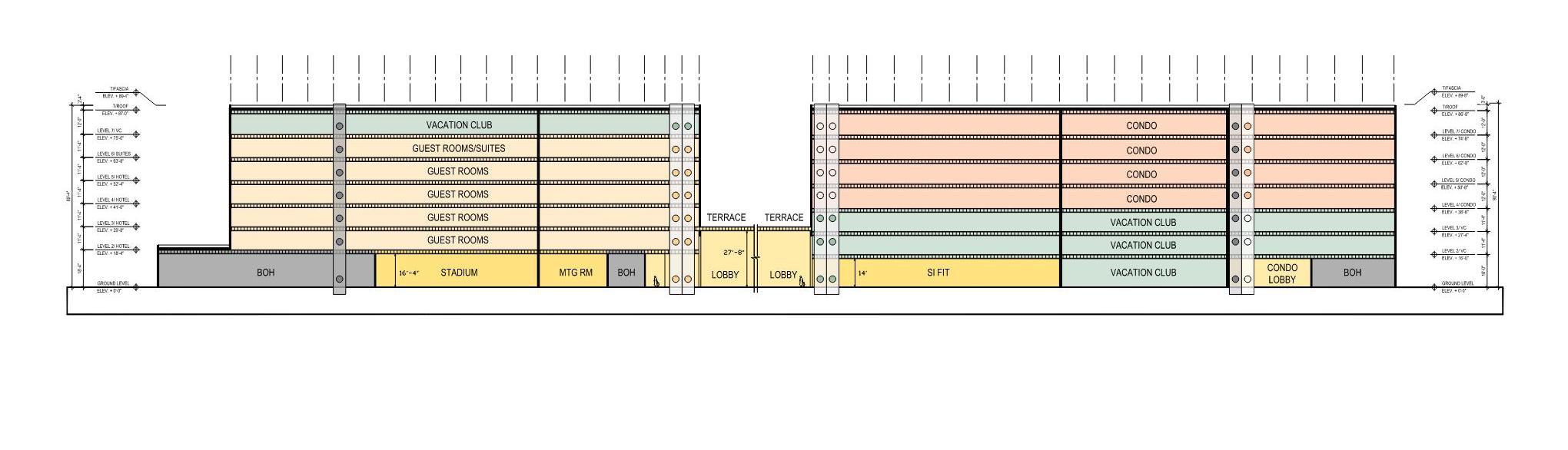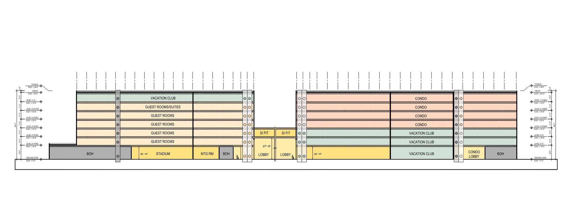 The vision is to create a vibrant resort that serves active lifestyles, attracts sports enthusiasts, and engages the broader Tuscaloosa community. The collaboration involves designing key structures like the SI Hotel, a high-rise with 150 rooms; a mid-rise condo and vacation club; and additional amenities such as a pool, cabana, fitness center, and a central services building.