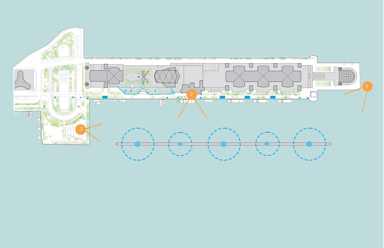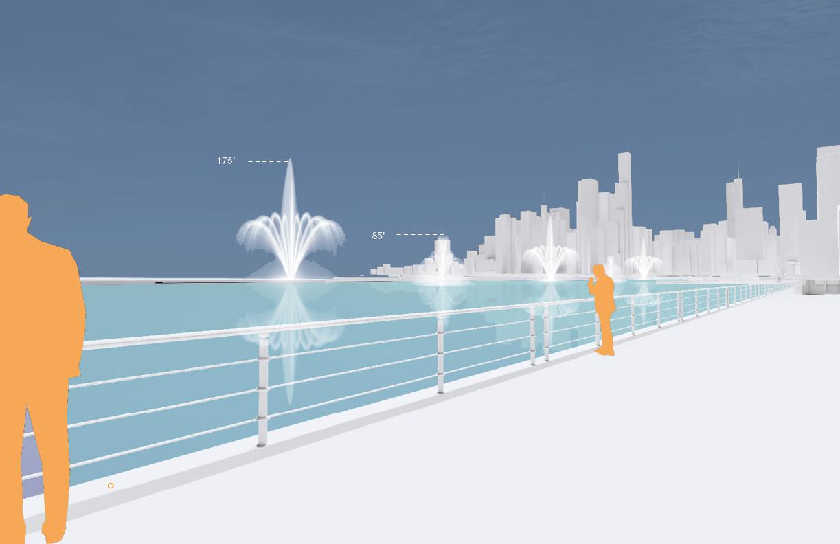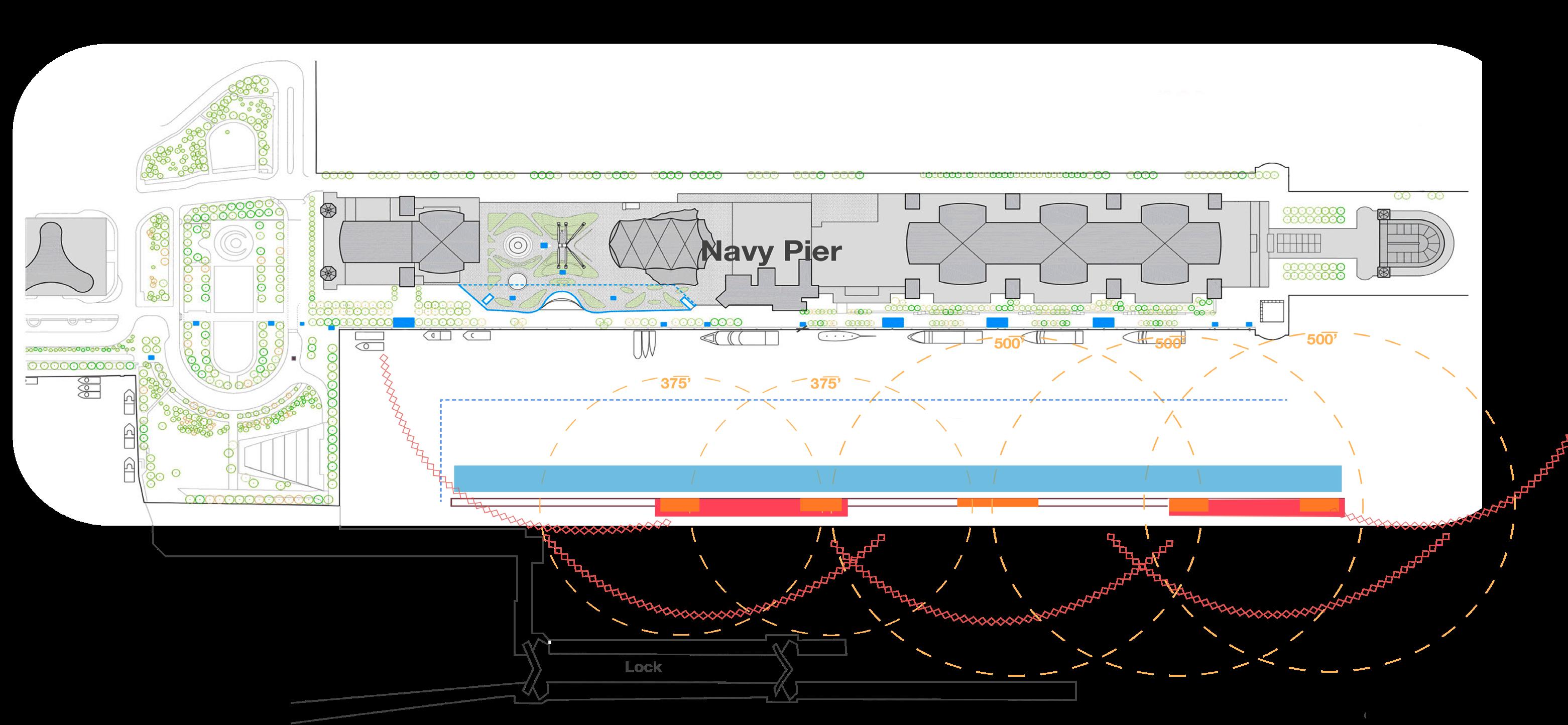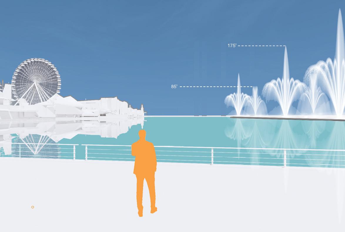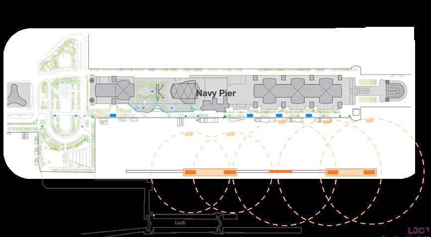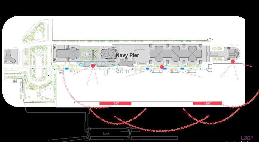 To ensure project success, key program requirements were addressed, focusing on safety and logistics for fireworks, fountain shows, and drone displays. This includes establishing a stable, non-flammable surface for fireworks, exploring modular or fixed fountain installations to adapt to climate conditions, and designing infrastructure for precise drone landing and takeoff. Thoughtful design and community involvement will position the revamped Dime Pier as a dynamic space for social interaction and cultural engagement, enhancing the overall experience at Navy Pier.
