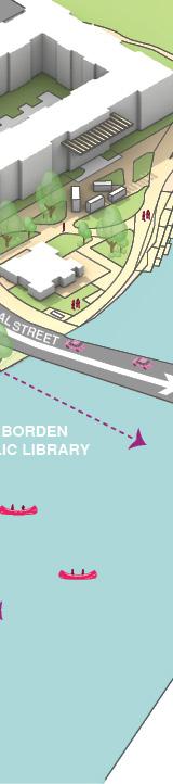 Recreational amenities will include various gathering spaces supported by seasonal and permanent concessions, complementing Festival Park. Key design principles focus on maintaining a continuous public edge along the river, prioritizing housing diversity, providing a range of destinations, transitioning density, enhancing public park spaces, and promoting bike and pedestrian mobility.