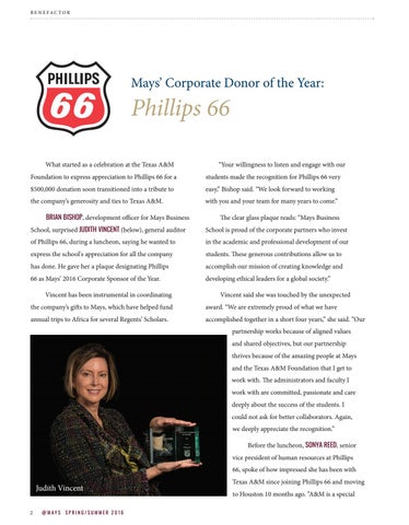 accomplished together in a short four years,” she said. “Our partnership works because of aligned values and shared objectives, but our partnership thrives because of the amazing people at Mays and the Texas A&M Foundation that I get to work with. The administrators and faculty I work with are committed, passionate and care deeply about the success of the students. I could not ask for better collaborators. Again, we deeply appreciate the recognition.” Before the luncheon, SONYA REED, senior vice president of human resources at Phillips 66, spoke of how impressed she has been with
