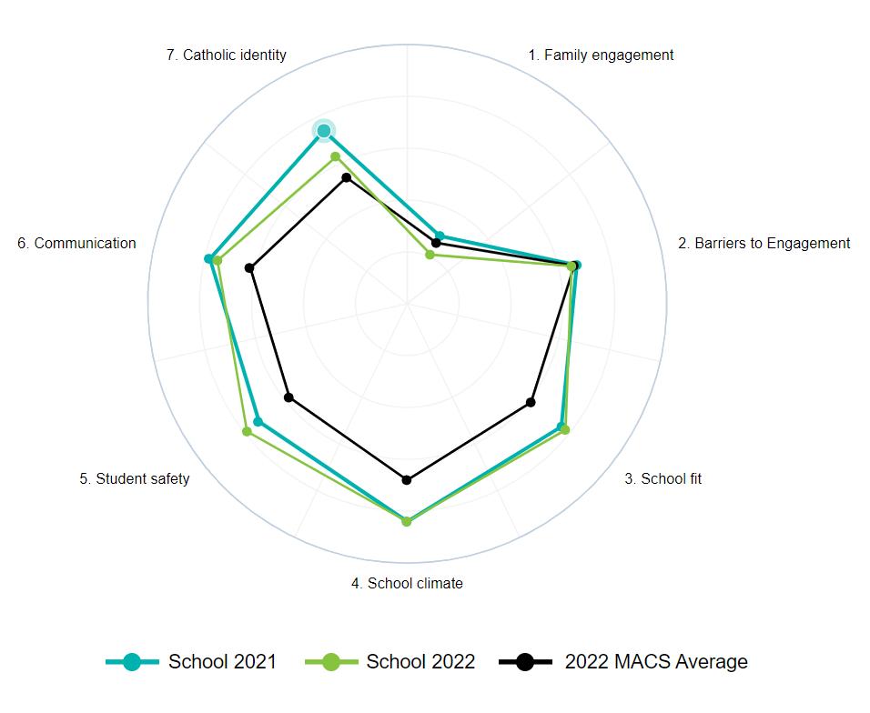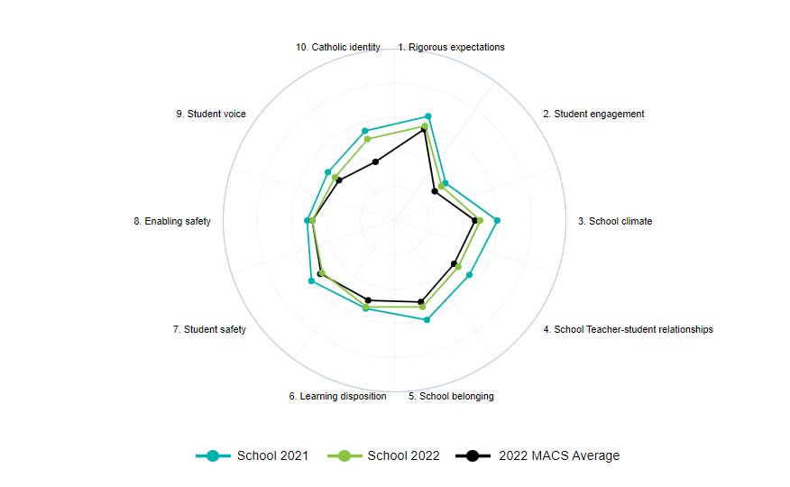 Our teaching staff show a great sense of self-efficacy, and express trust in our school culture, as borne out by results in the MACSSIS survey. Negative ratings in many categories are below 10% including student safety, school climate, staff leadership relationships, support for teams, collective efficacy, and Catholic identity. It is worth noting that while feedback scores were low, the College has moved to offering an annual review meeting with each staff member each year. We anticipate that this will lead to a greater sense of individual feedback.