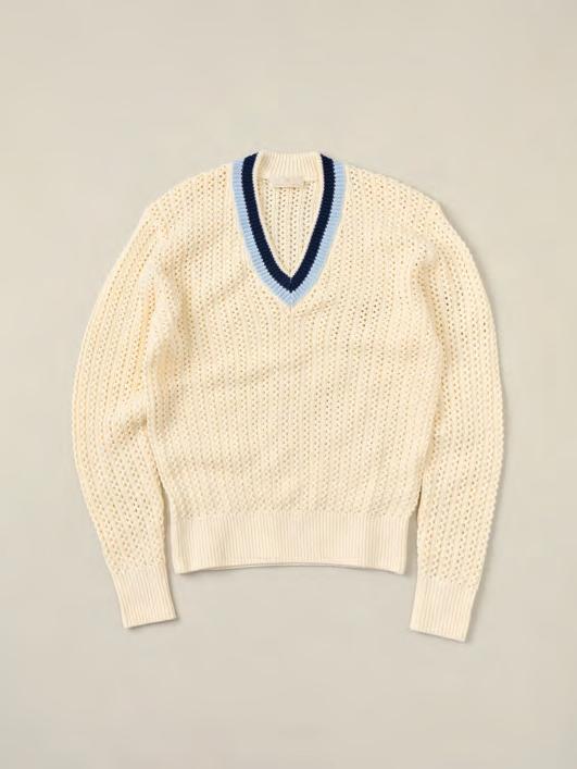 THE CLASSIC KNITWEAR WITH INSPIRATION FROM CRICKET AND TENNIS CRAFTED IN A HEAVY OFF WHITE KNITTED COTTON WITH A V-SHAPE COLLAR WITH A NAVY AND GREEN STRIPE