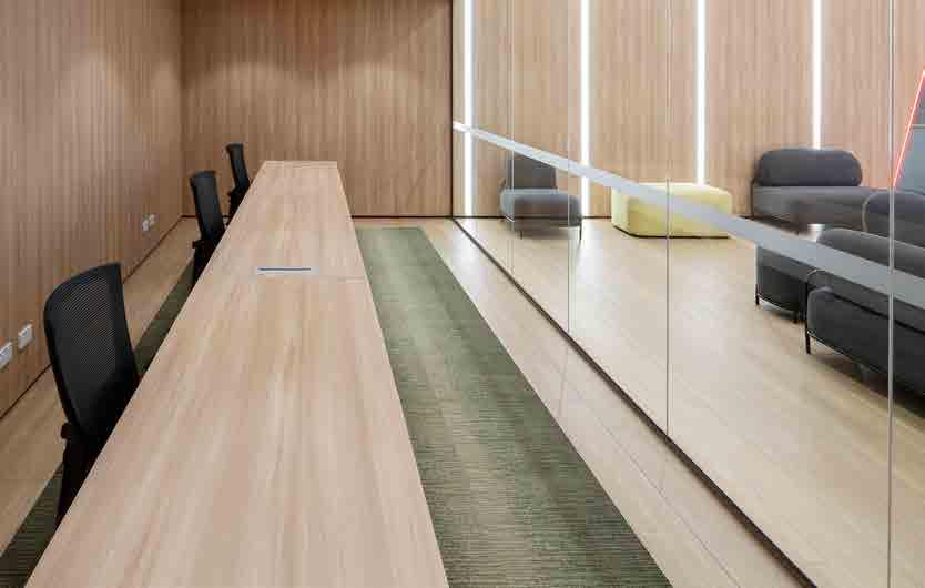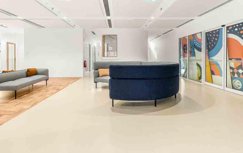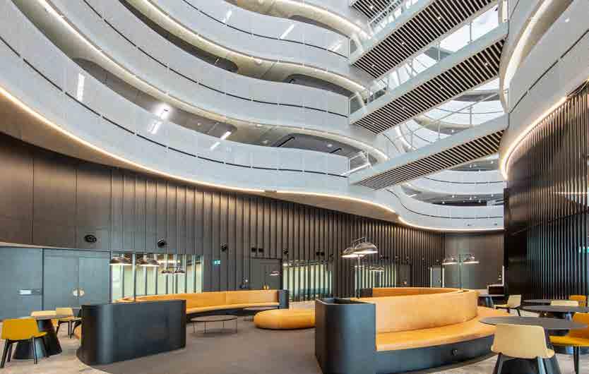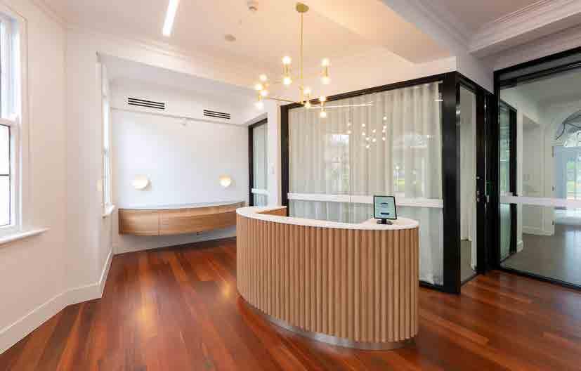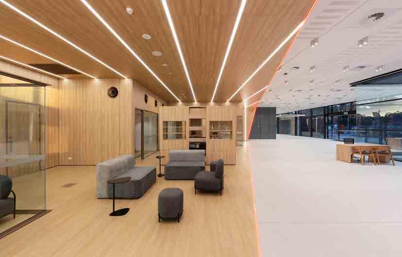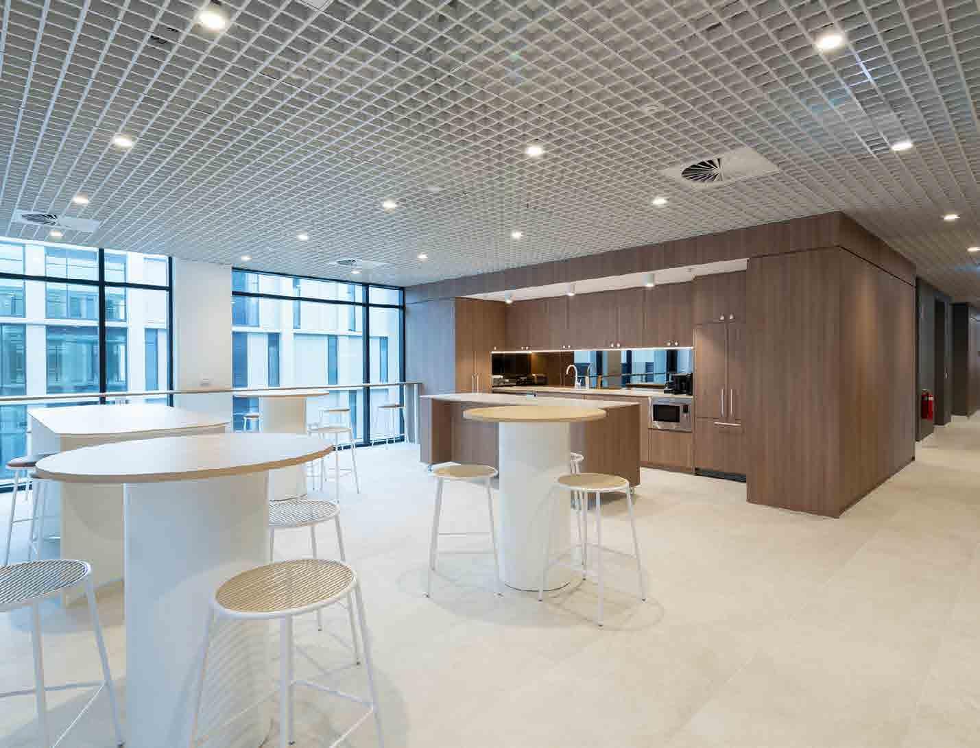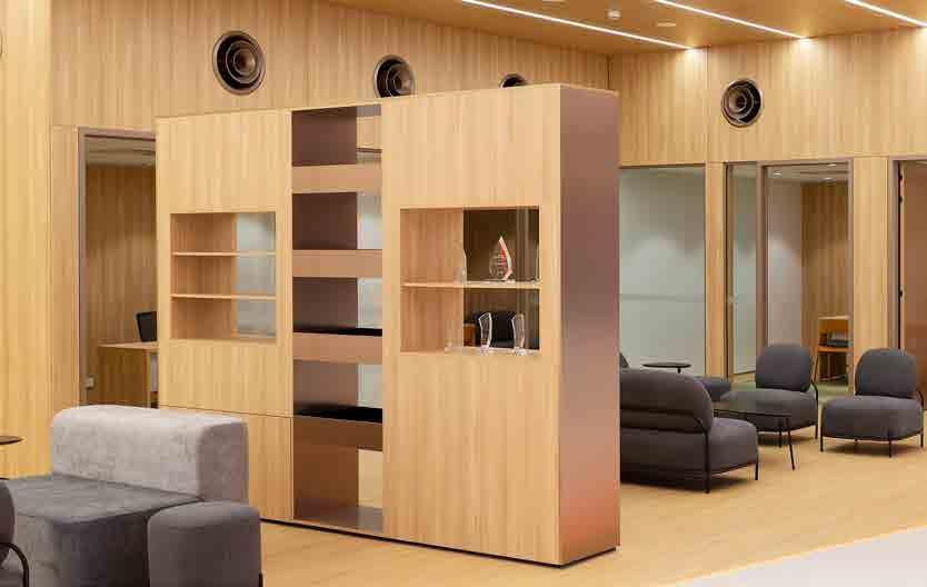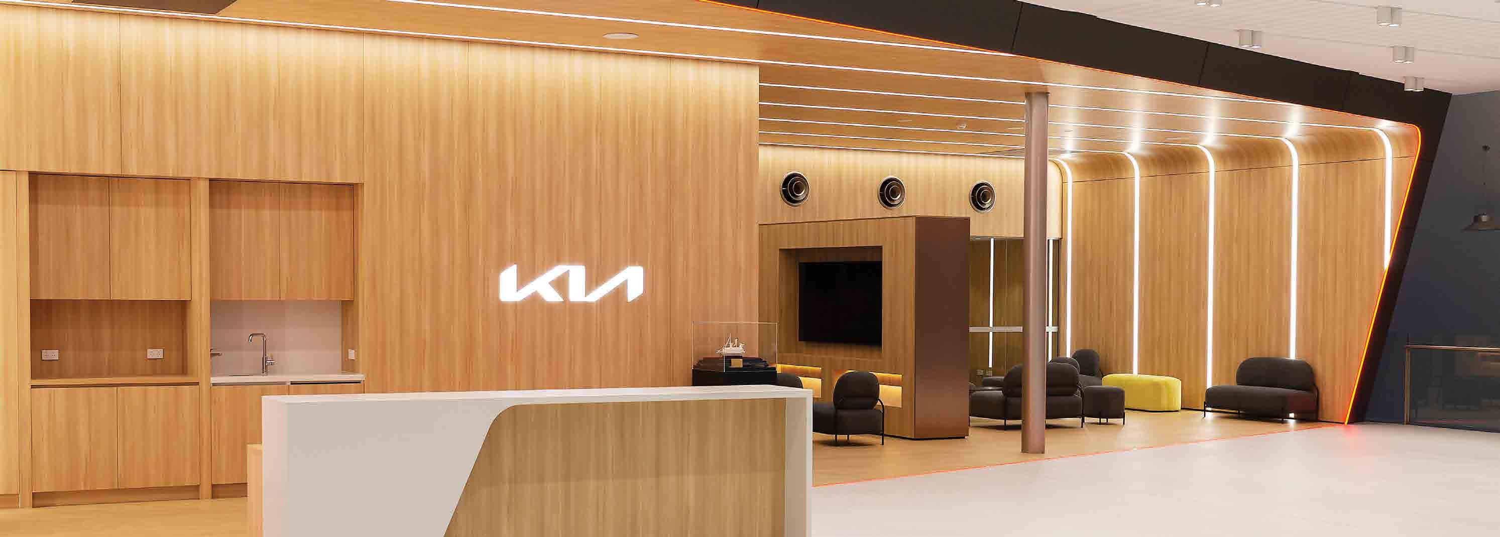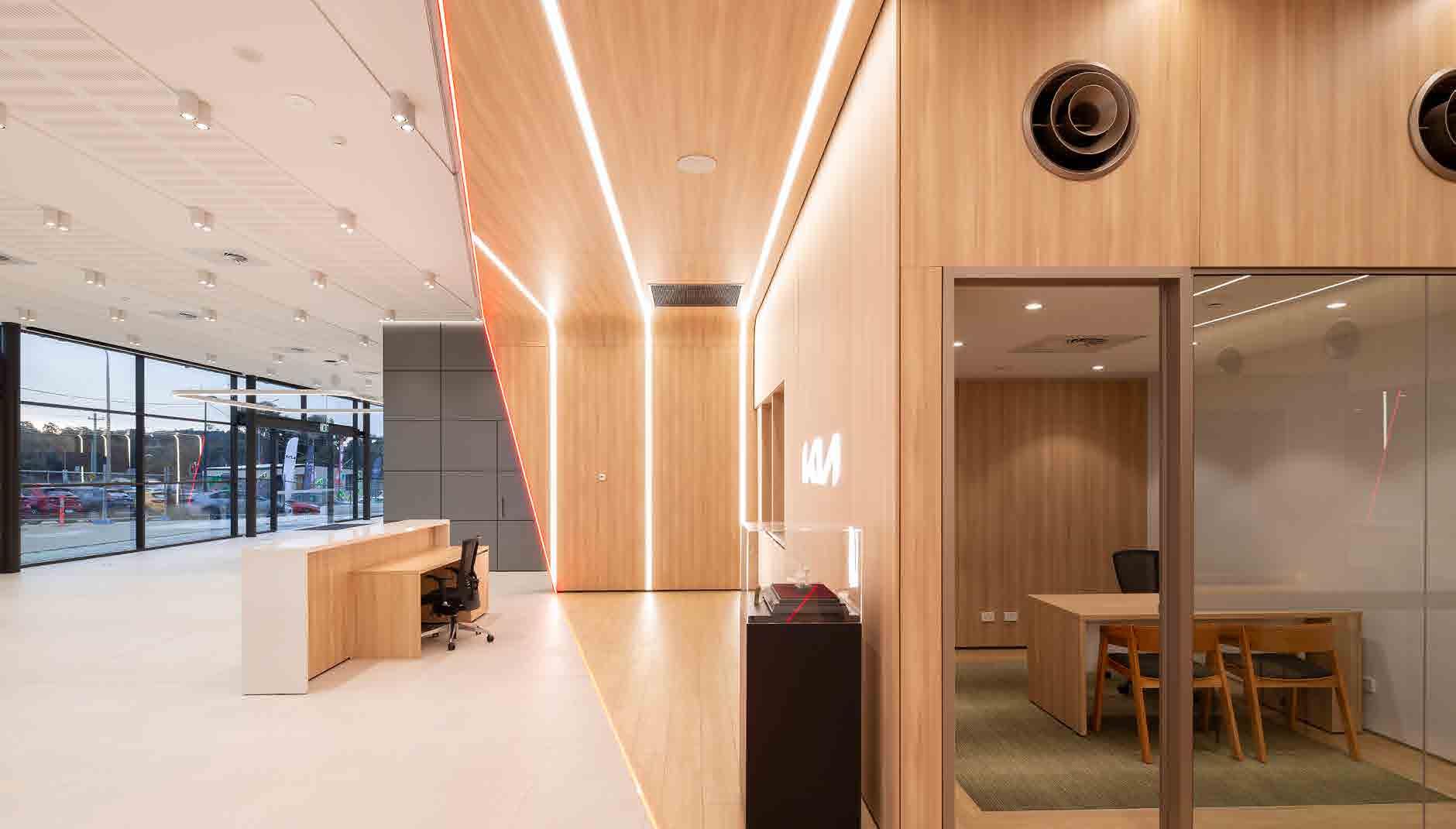 This John McGrath Kia Showroom was refurbished to meet the demanding standards for Kia’s new national pilot location. The choice of materials was vital in achieving the client’s design aspirations while providing a functional space. Entry wall-panels and storage were camouflaged by sleek Alfrex cladding. Curved panels made from Polytec Plantation Ash Woodmatt provided flexibility and warmth. Internal walls were glazed with a luxurious bronzed powder-coated finish and surface panels consisted of brushed bronze metallic laminate. In the exhibition space, a perforated Gypsum board ceiling improved acoustic performance and created a contemporary grid design. Given the complex shape of the internal fit out and the variety of finishes, precision was paramount during the set-out and installation processes. The seamless integration of materials was achieved through precise laser leveling, close collaboration with the workshop and flawlessly cut panels.