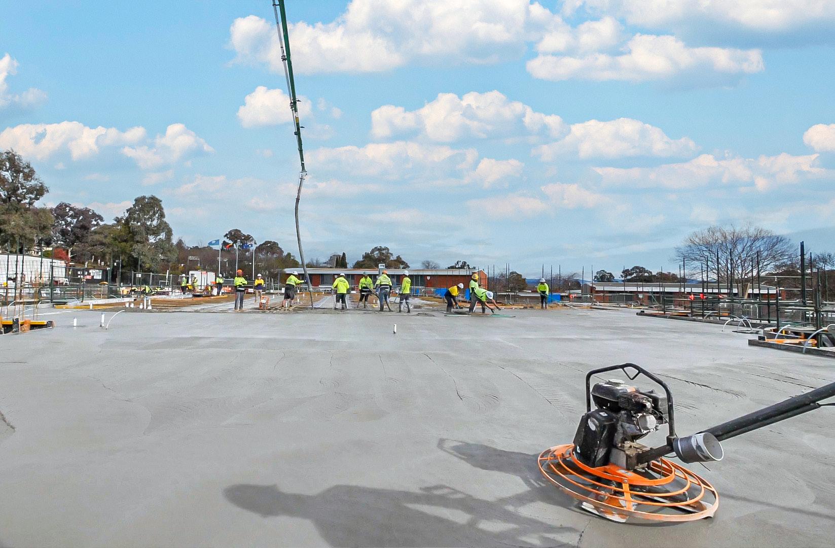 Risk assessment workshops were used to identify the safest methodologies, including a 200-page manual for the design, installation and pouring process of the auditorium. The underside of the roof is 14m from the auditorium’s floor and would usually require falsework. To contravene the significant risks of material handling, falls and difficult access, Construction Control installed a structural steel truss system and a permanent formwork system. The beams and Bondek were installed from knuckle booms that provided fall protection, and mesh was installed above the structural beams and the formwork to act as a safety net if the formwork and concrete were to collapse.