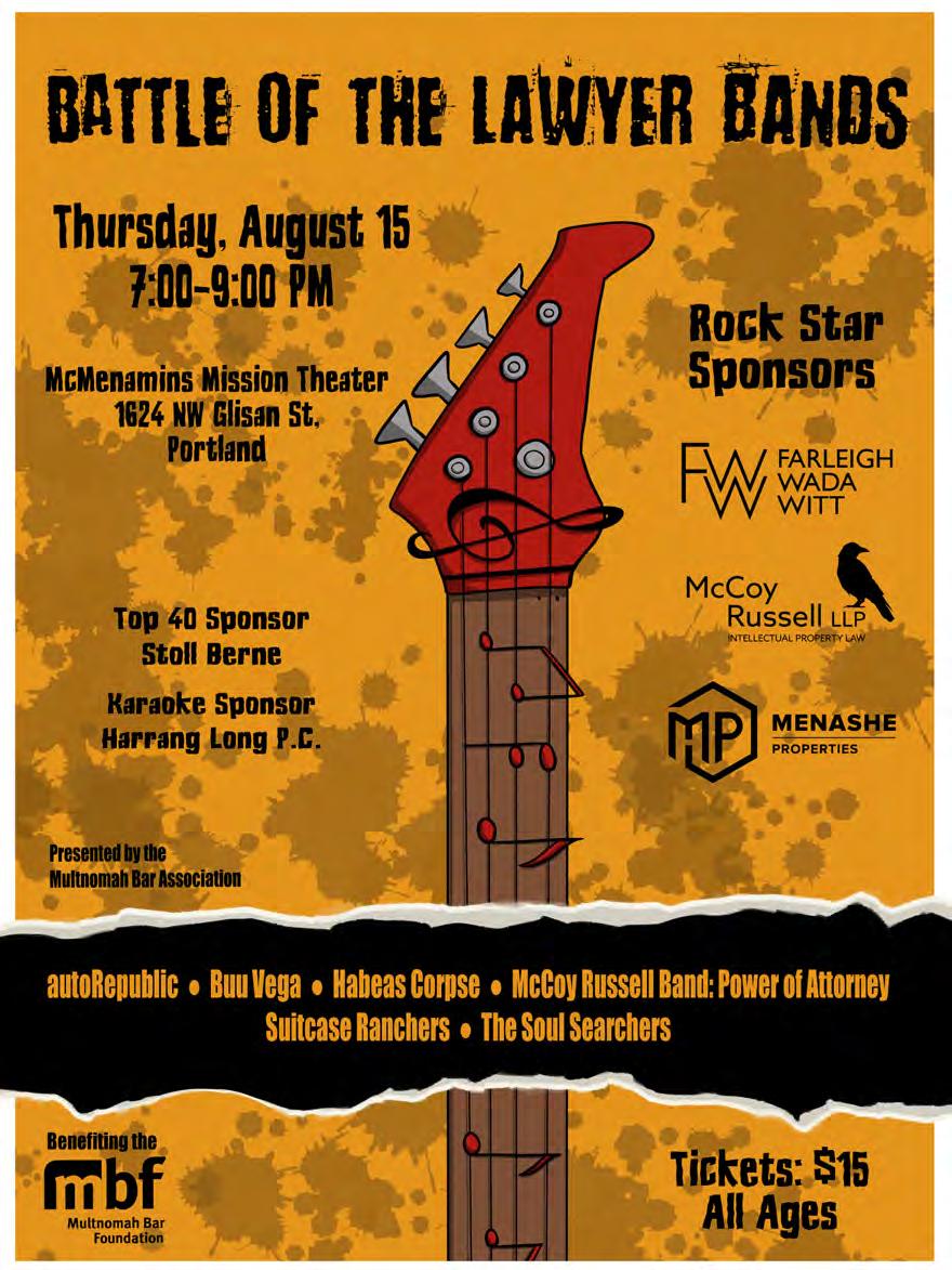 I look forward to catching up with committee volunteers, bar colleagues, and our community members as a whole, as well as welcoming new members, for another outstanding year of programming, CLEs and events. I hope to see you at the MBA’s Battle of the Lawyer Bands on August 15th at the McMenamins Mission Theater (an event that is near and dear to my heart as one of the original organizers). And don’t forget to sign up for the MBA Absolutely Social on October 15th at the Multnomah Athletic Club.
