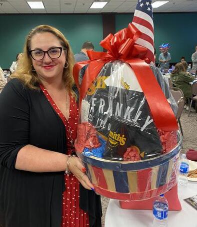center) of Northwest Bank was the winner of the luncheon’s raffle basket, including various Smith Provision merchandise and gift card and 10 ticket vouchers to an upcoming Erie Seawolves game.