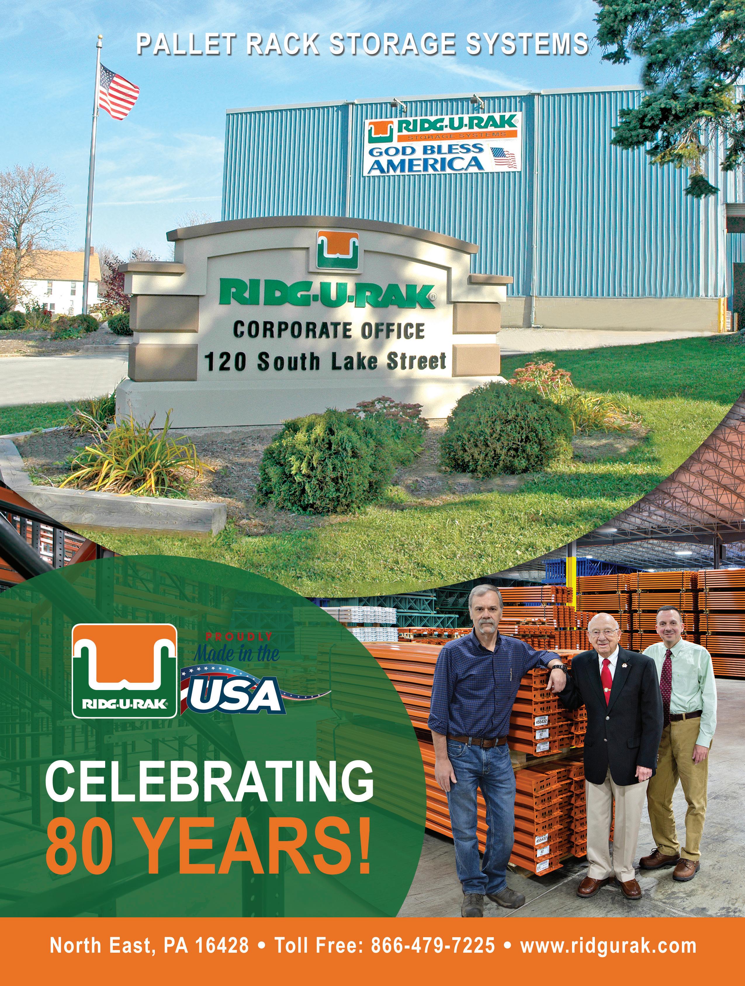 Ridg-U-Rak now has two plants in North East, Pennsylvania, covering 160,000 square feet, with a production capacity of more than 140,000,000 pounds of finished steel products per year. With the addition in 2018 of its five-and-a-half-acre, under roof, warehouse and distribution center, Ridg-U-Rak has greatly increased the efficiency of its shipping department and freed up space for increasing manufacturing capacity at the main plant. These improvements are what contribute to it remaining one of the largest storage rack manufacturers in North America, and it is still a family owned business.