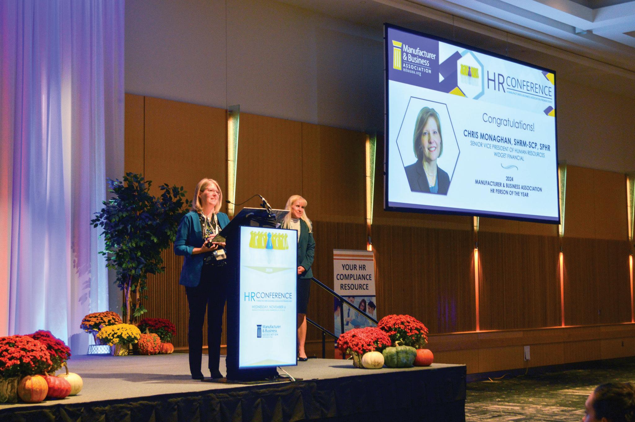 Chris Monaghan of Widget Financial is presented the MBA HR Person of the Year Award by MBA President and CEO Lori Joint.