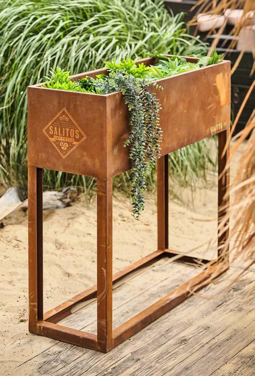 A design with sharp edges and character. Solid softwood at the base, enhanced Corten steel on top. 4-sided SALITOS branding. Looks great everywhere.