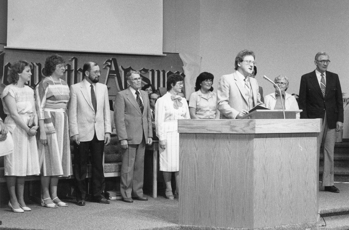 John Wiens behind the pulpit, introducing new pastoral couples on stage at a Saskatchewan MB Conference convention. Walter Balzer stands at the far right.