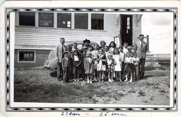 Teachers Henry Peters (left) and Henry Walde (right) with Daily Vacation Bible School students at Towers, Alberta.