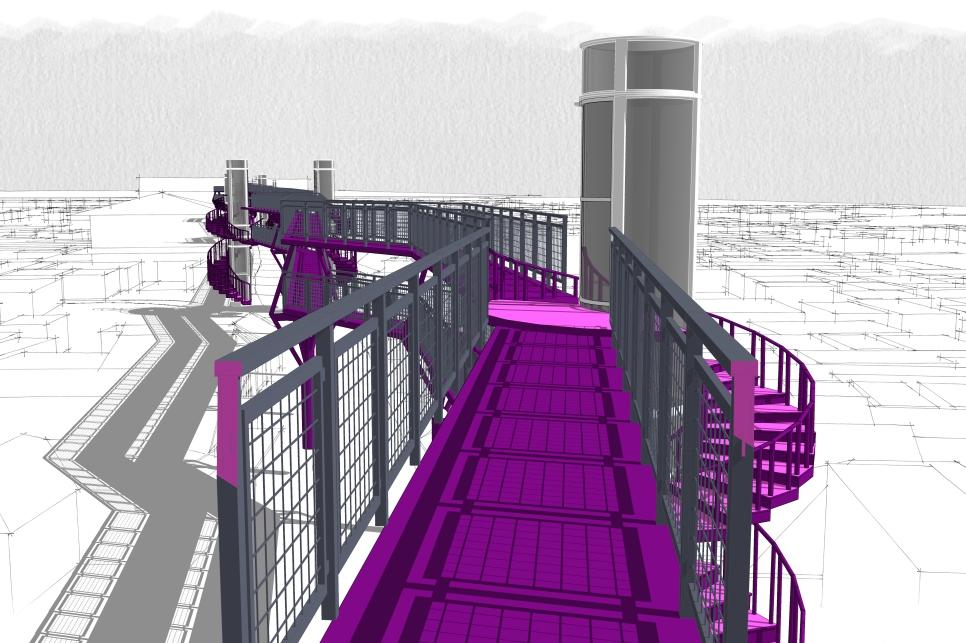 Memperlihatkan view dari atas Skywalk dan bagaimana sirkulasi pada skywalk tersebut.