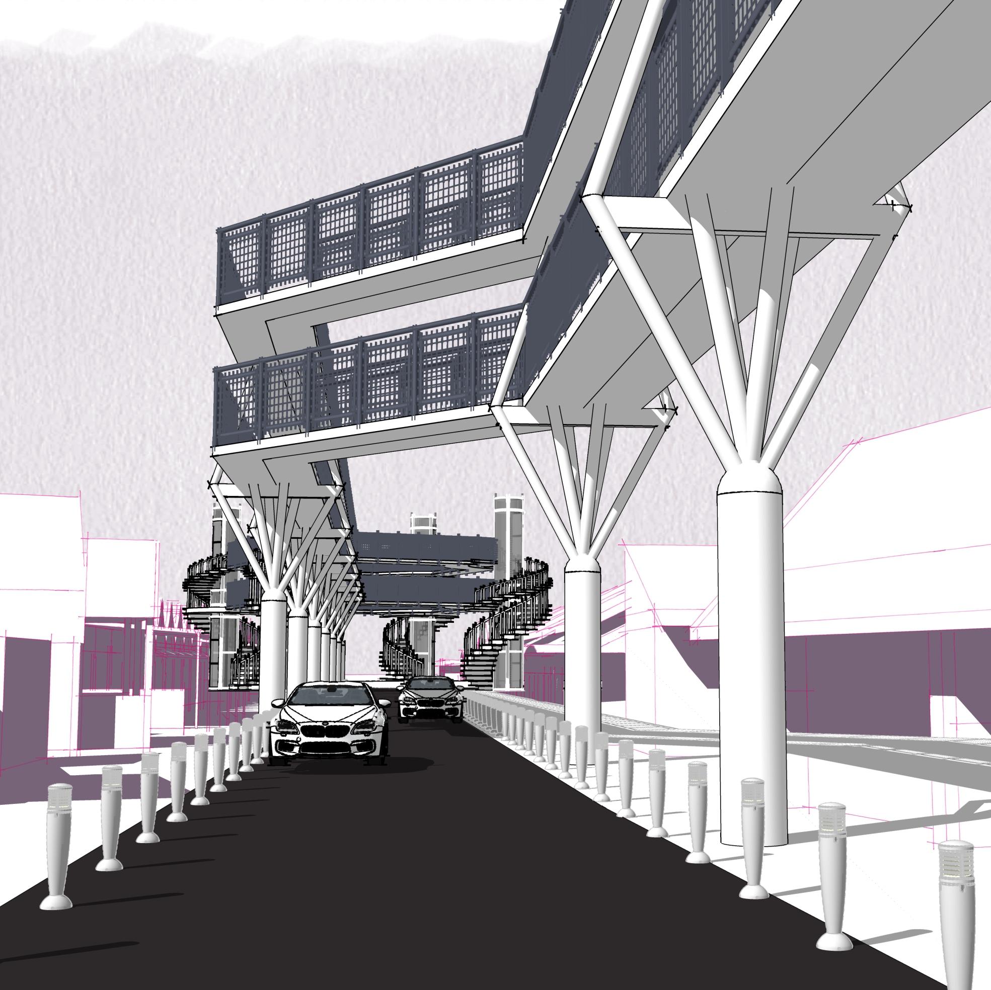 Pada desain ini yang saya terapkan pada desain node saya yaitu konsep skywalk sebagai penghubung dua area yang berbeda dan memecah kepadatan dengan memberikan elevasi yang berbeda untuk pengguna jalur pedestrian.